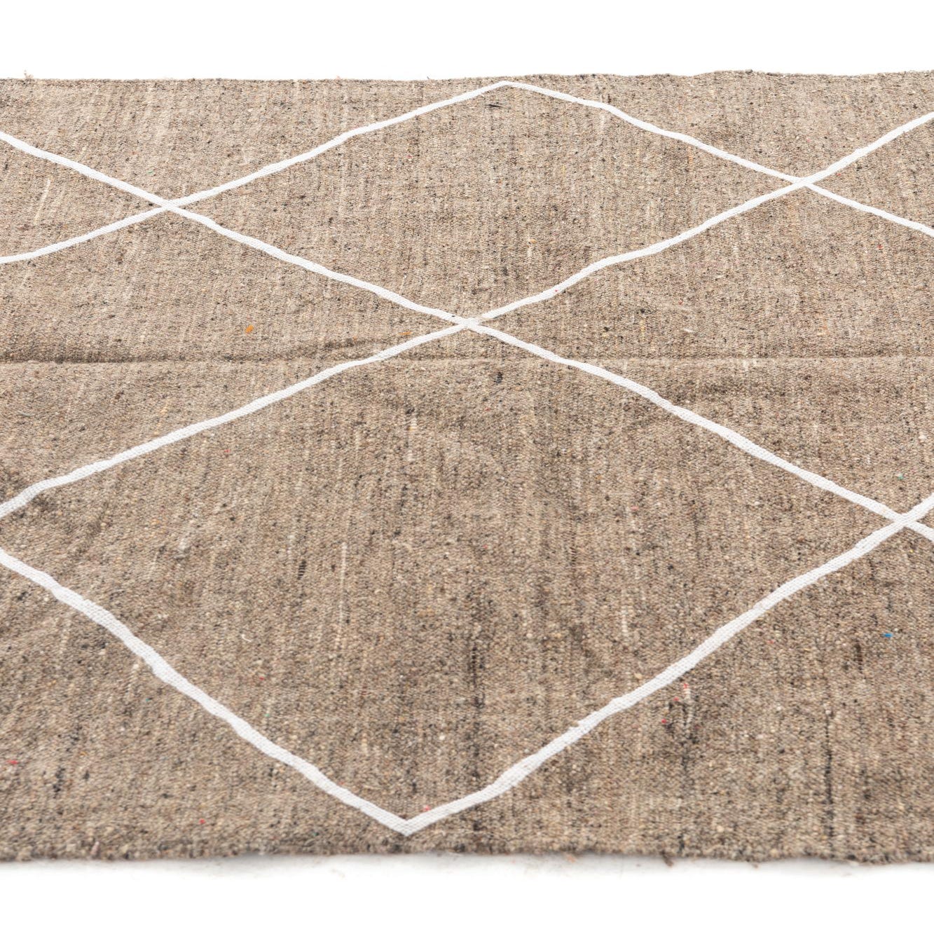 This rug's simple yet engaging design works well with modern, Scandinavian, and even industrial-inspired interiors. Its understated color palette pairs well with natural materials like wood and leather, while its geometric pattern can serve as a statement piece within a minimalist space. The rug's textured weave and rich natural wool fibers would also suit a cozy, rustic environment, grounding the space with its earthy tones.