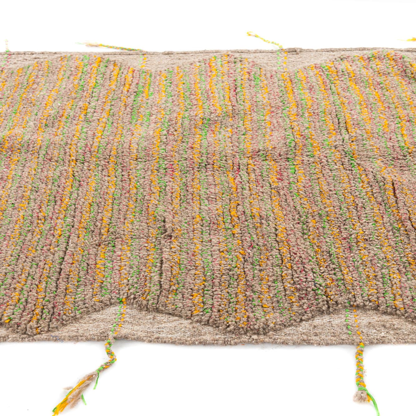 A 4x6 rectangular brown shag rug with subtle horizontal stripes in green, orange, and red, featuring braided tassels.