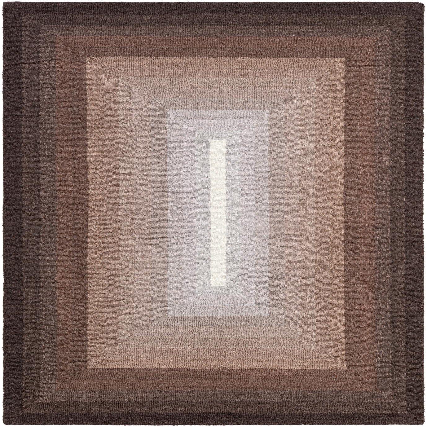 A rectangular 4x6 brown and tan wool rug with a gradient ombre pattern of concentric rectangles, darkest at the edges and lightest in the center.