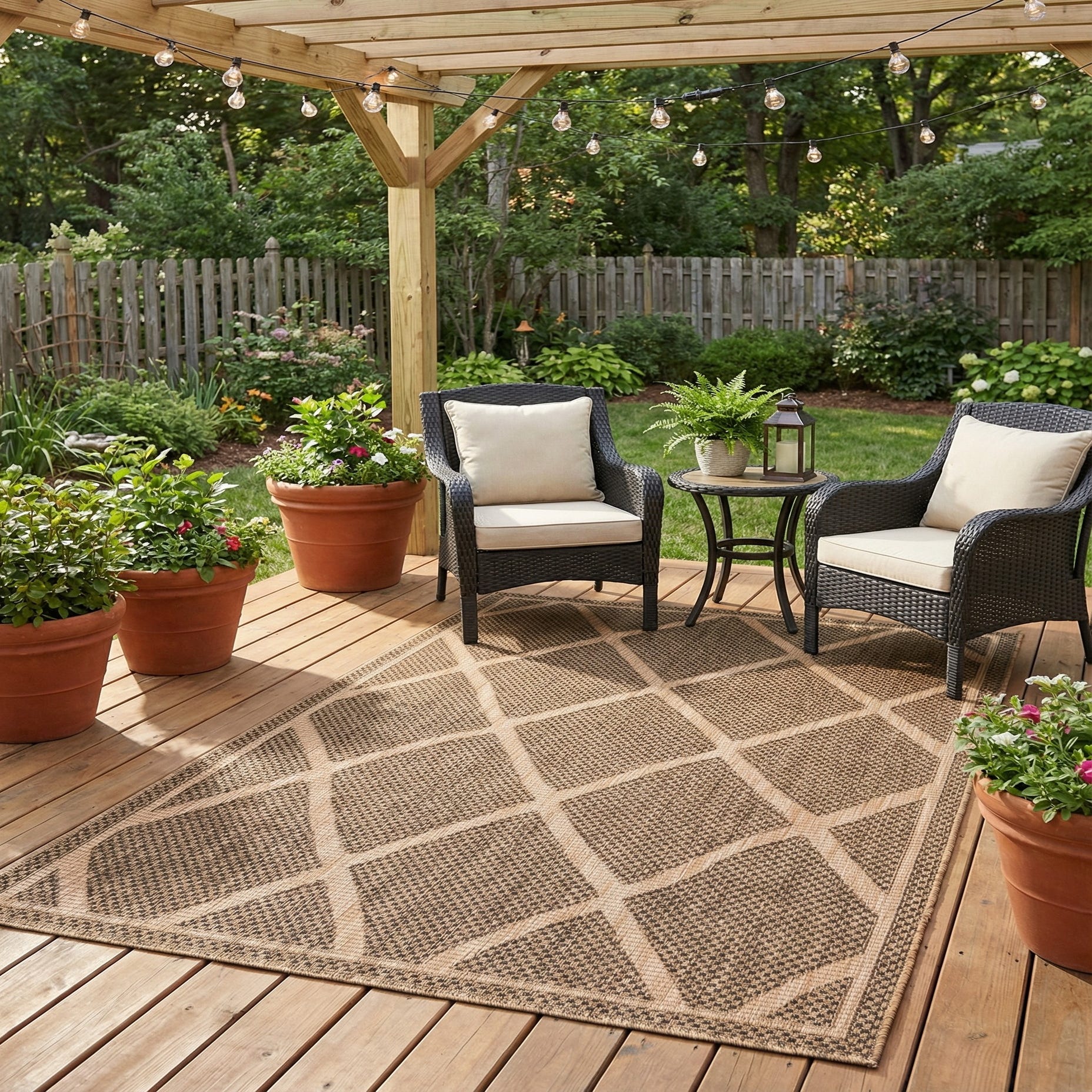 A 4x6 rectangular brown and tan indoor/outdoor rug with a modern trellis pattern, suitable for a patio or living room.