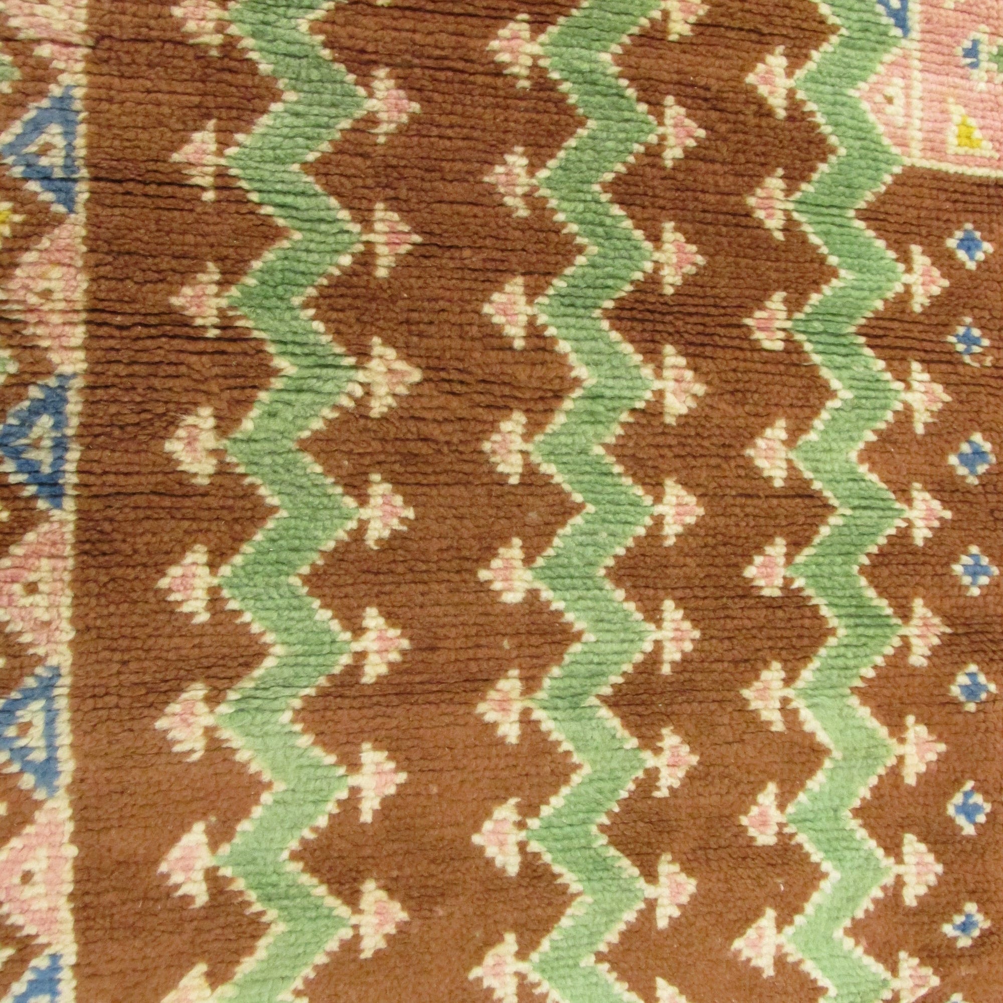 Primary color is Brown. Colors in this rug include: Brown, Green, Blue, Pink, Yellow.