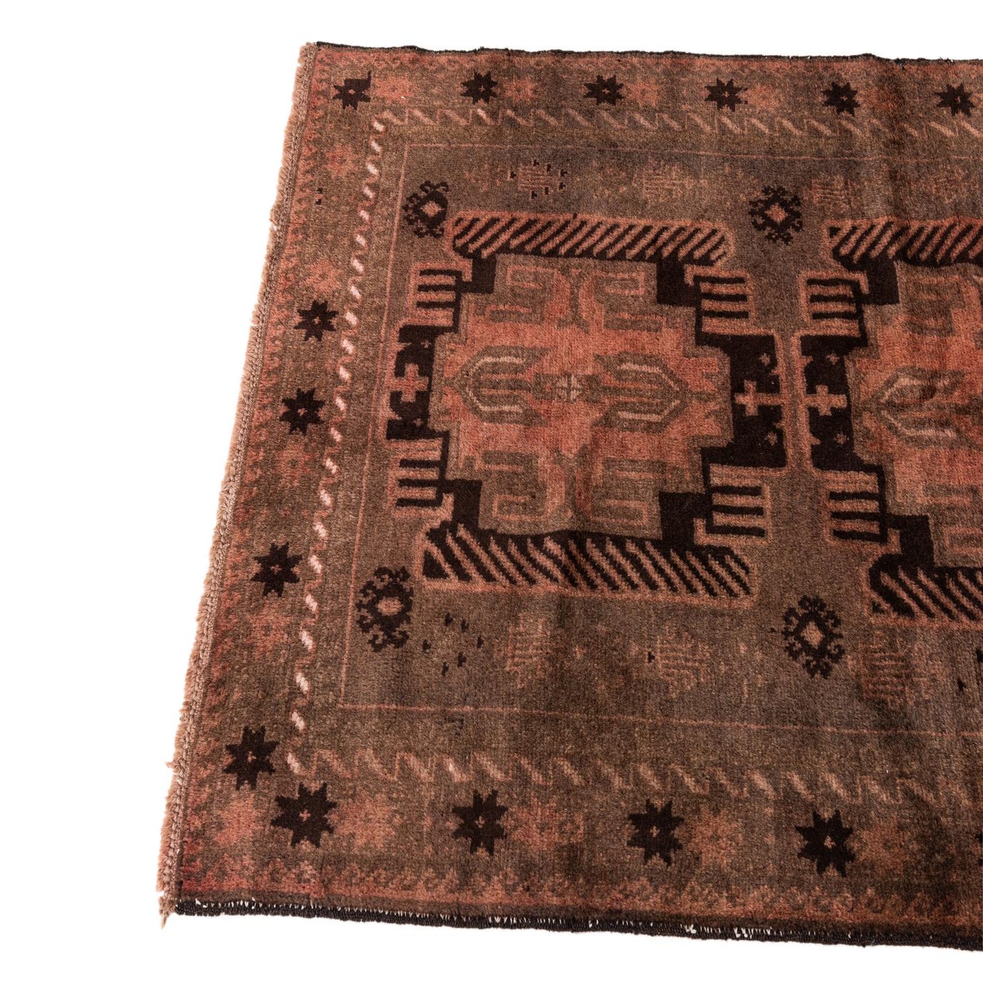 The design is traditional with a geometric tribal inspiration, which showcases a series of repeated motifs flanked by decorative borders that emphasize the rug's handcrafted aesthetic. The incorporation of fringe adds an extra dimension of texture and character, giving the rug an authentic, artisanal finish.