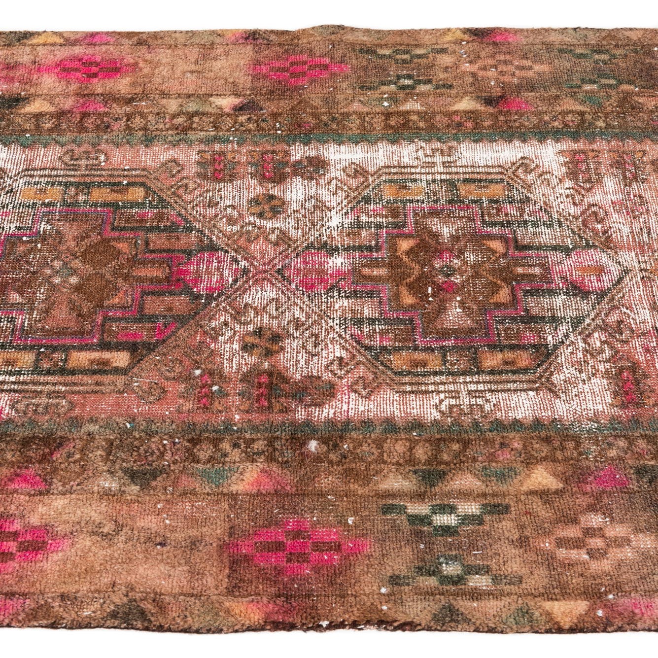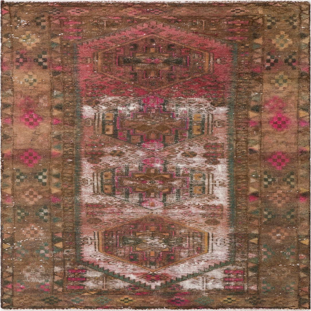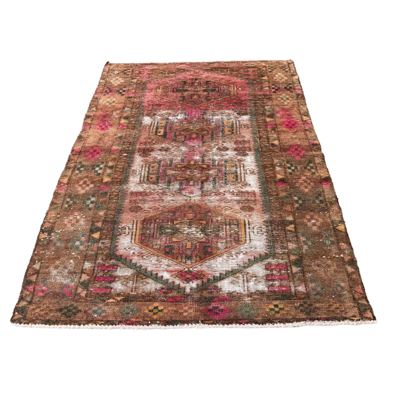 A 4x6 rectangular brown and tan Persian-style rug with a distressed medallion pattern in shades of pink, green, and white.