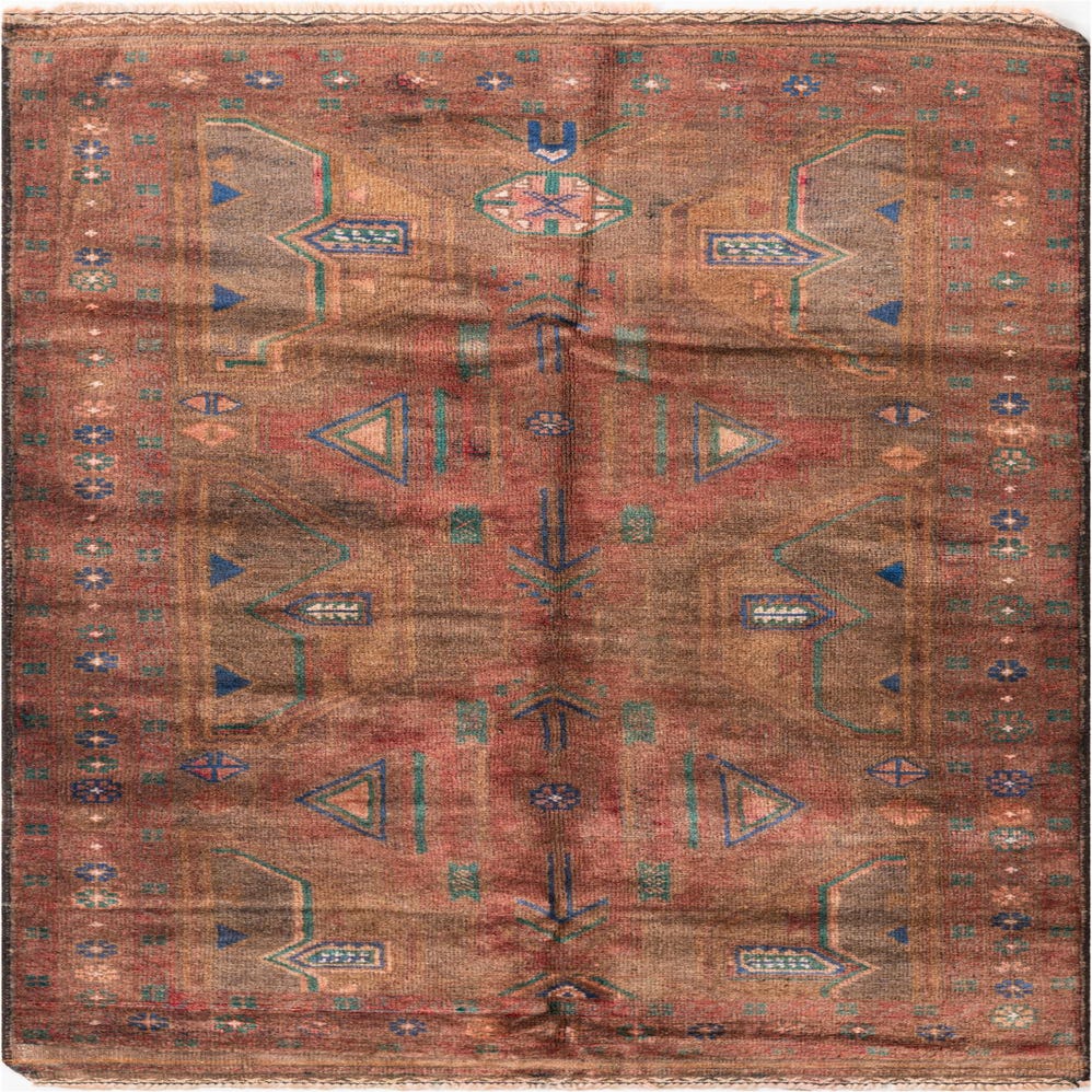 Primary color is Brown. Colors in this rug include: Brown, Blue, Green, Rust Red.