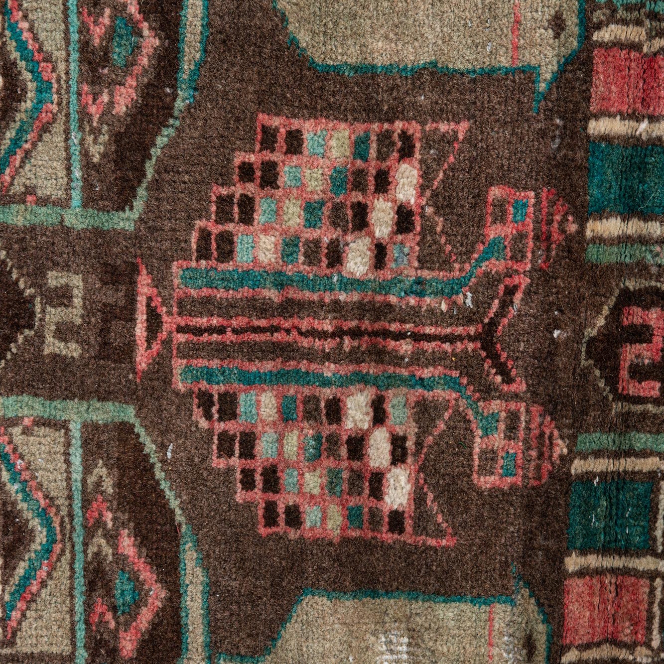 A 4x6 rectangular brown Persian rug with intricate teal, pink, and tan geometric patterns and stylized animal motifs.