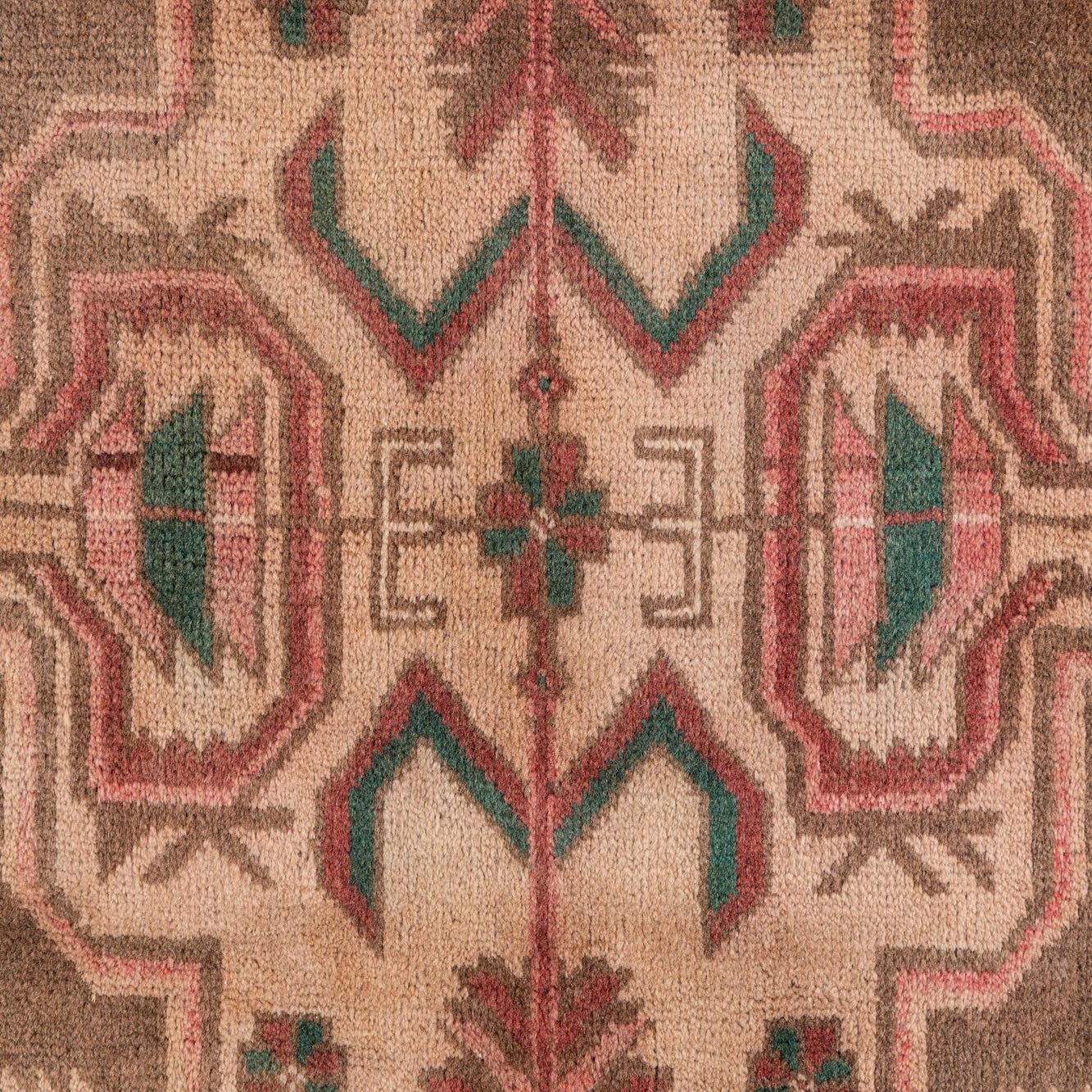Primary color is Brown. Colors in this rug include: Brown, Green, Ivory, Red.