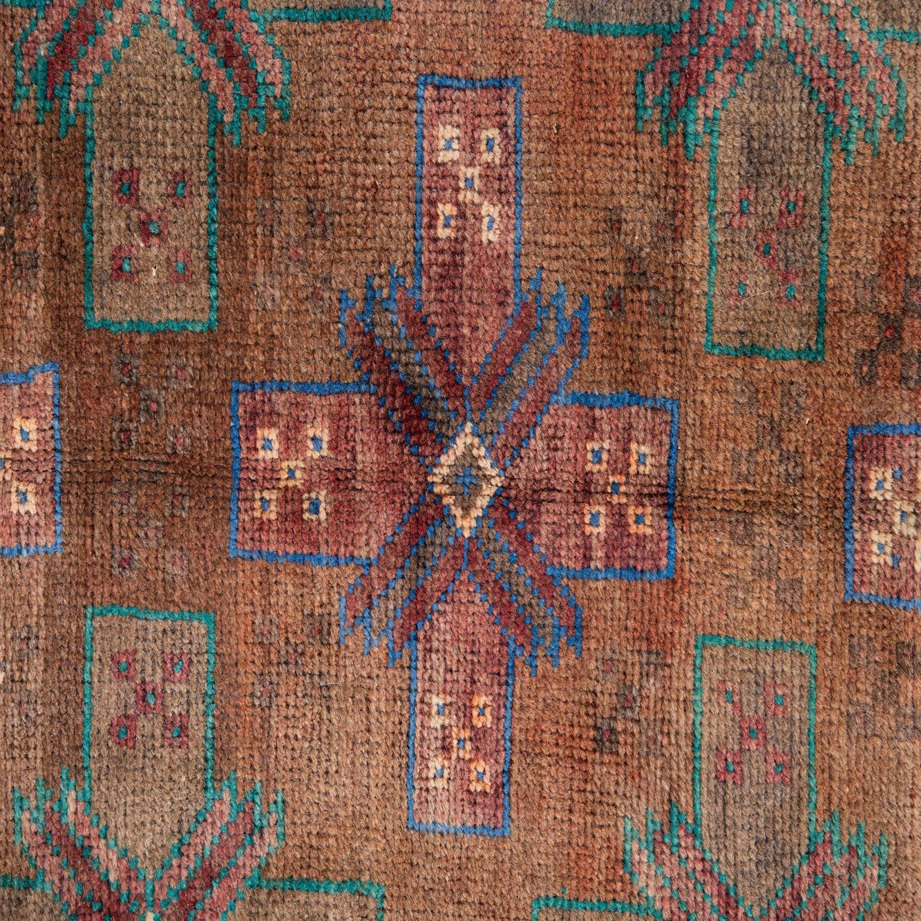A 4x6 rectangular brown and tan wool rug with a distressed Persian-style geometric pattern, featuring blue and red accents.