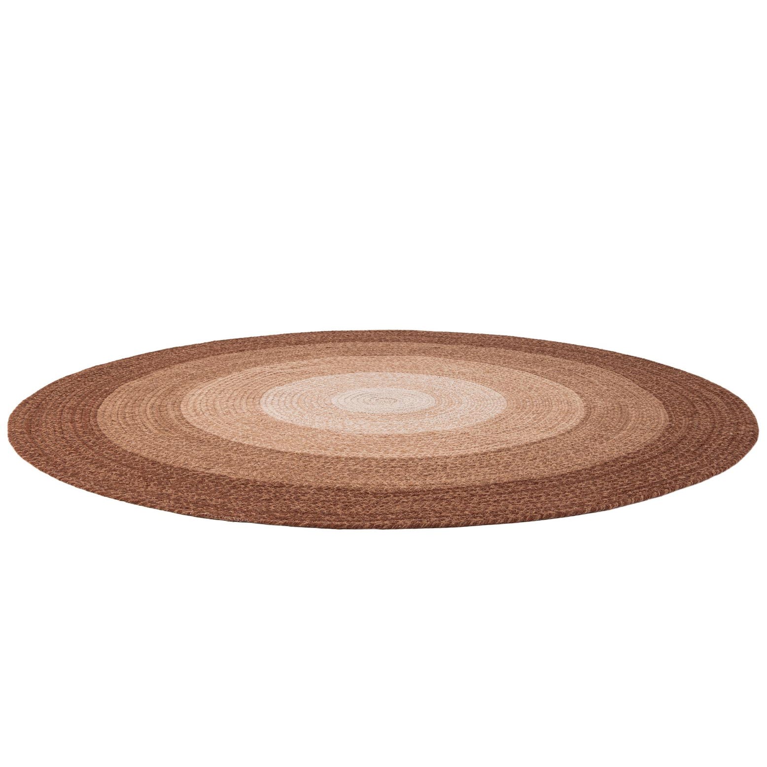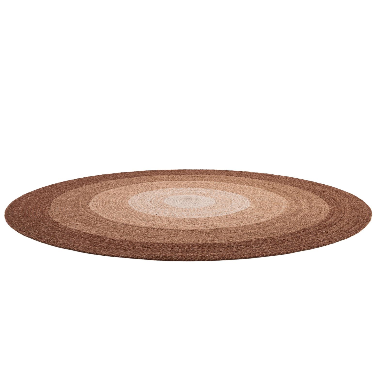 A round, hand-braided wool rug featuring concentric circles in varying shades of brown and tan, from dark to light.