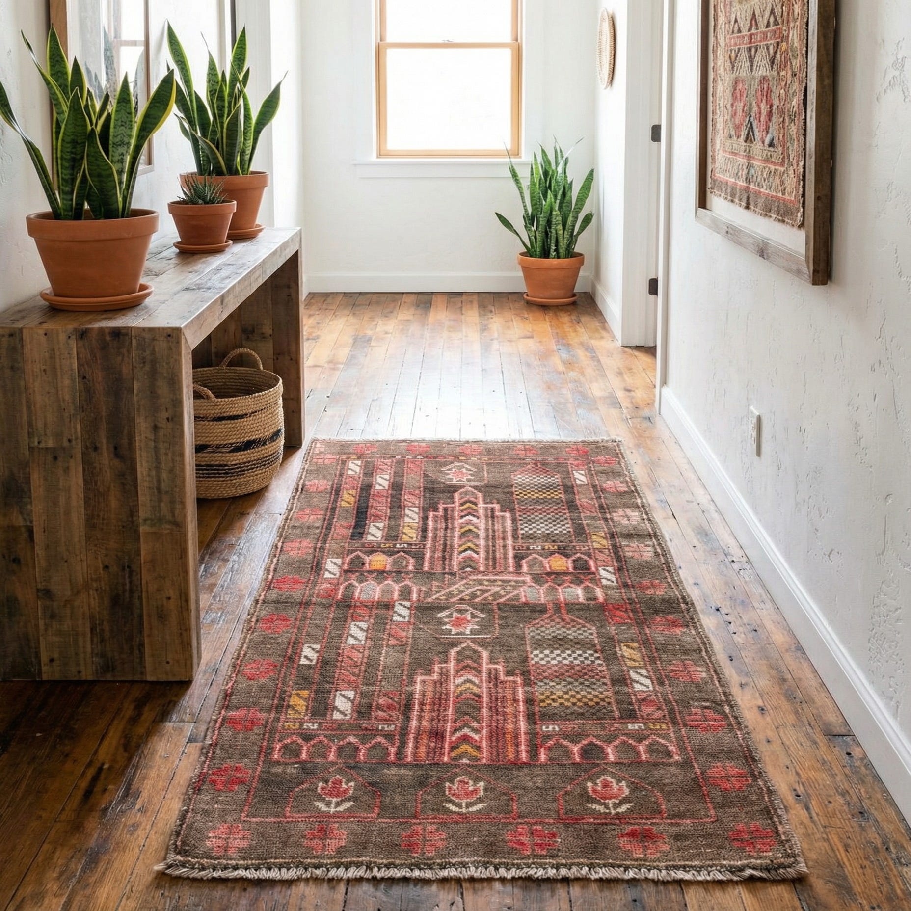 Primary color is Brown. Colors in this rug include: Brown, Ivory, Orange, Red.