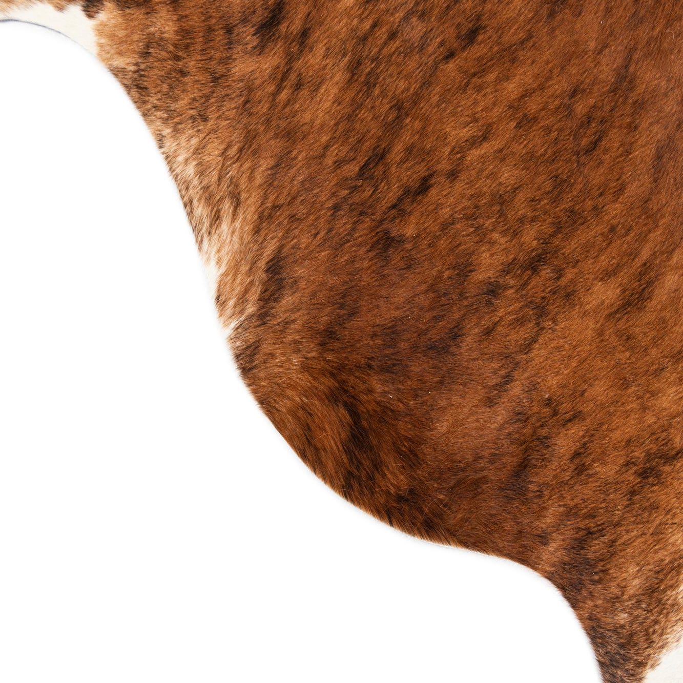 A 5' 3 x 5' 8 square cowhide rug with natural brown and tan brindle patterns and white accents.