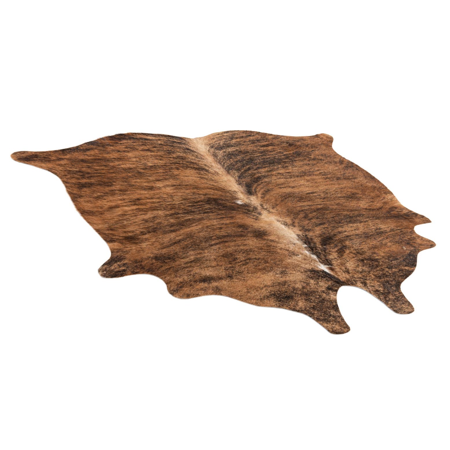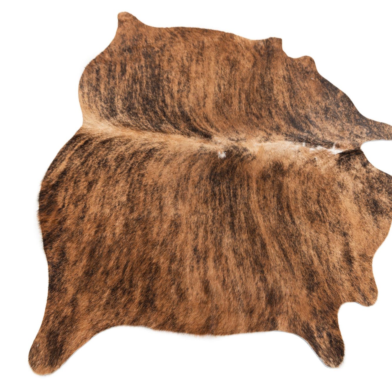 A 4'10 x 5'3 square cowhide rug in varying shades of brown and tan with natural brindle patterns.