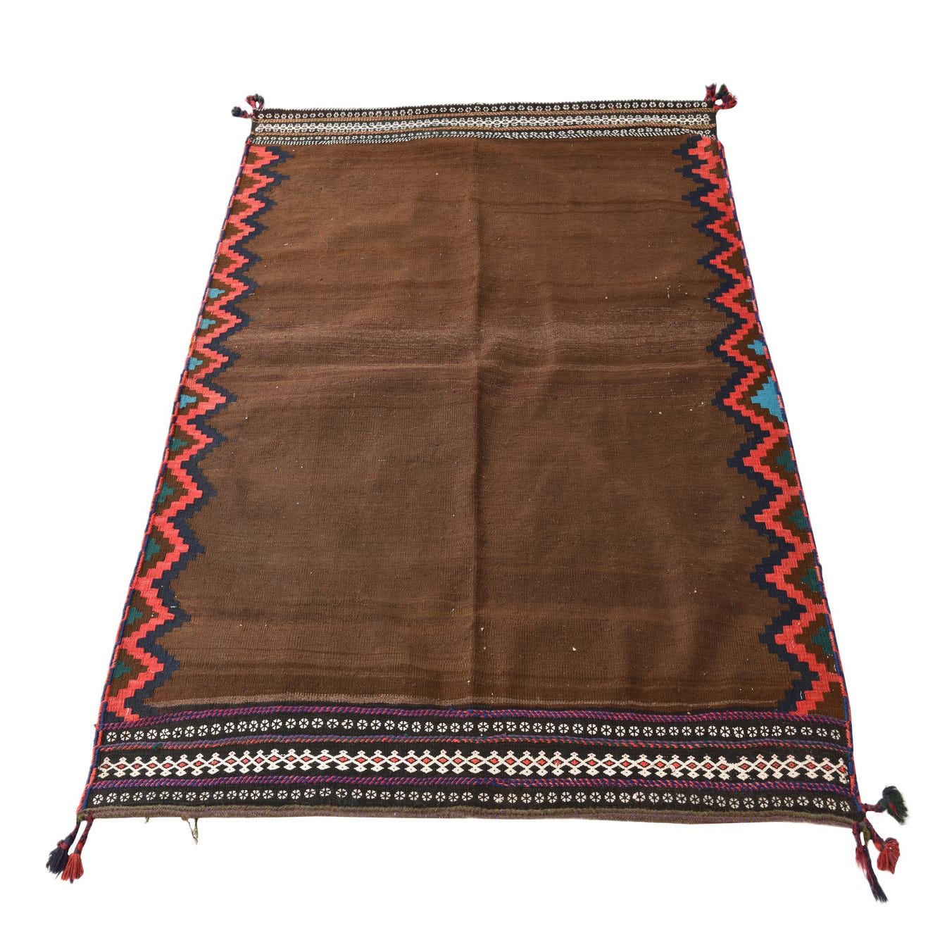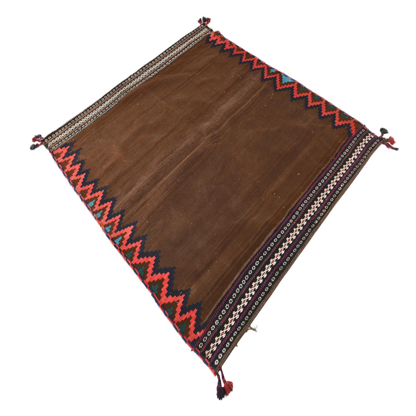 A 4' 7 x 5' 0 square Kilim Fars rug with a brown center and tribal zigzag patterns in red, blue, and green on the sides, with decorative striped borders.