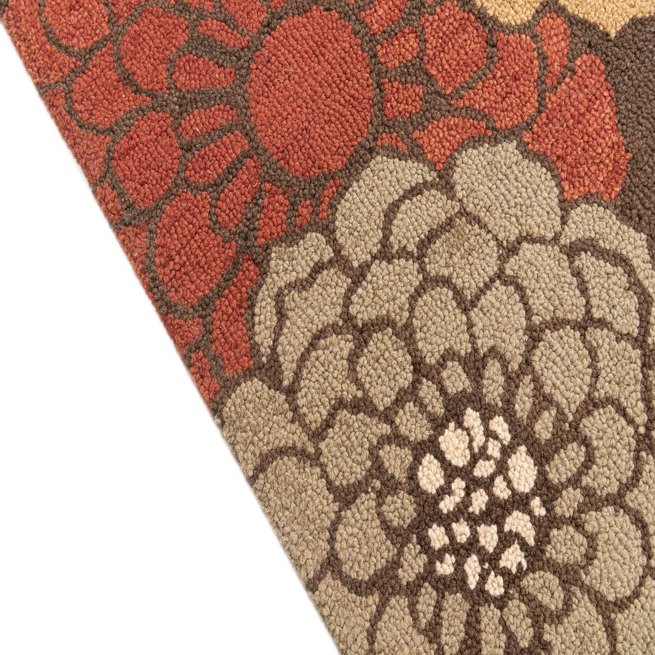 The Agra collection presents a hand-tufted wool and cotton rug in a 5x7 size that marries a modern aesthetic with classic design elements. The rug features an array of large-scale floral patterns, showcasing a warm and inviting color palette including brown, orange, tan, terracotta, and ivory. The brown background harmonizes with the bold floral motifs, providing a striking contrast and visual depth.