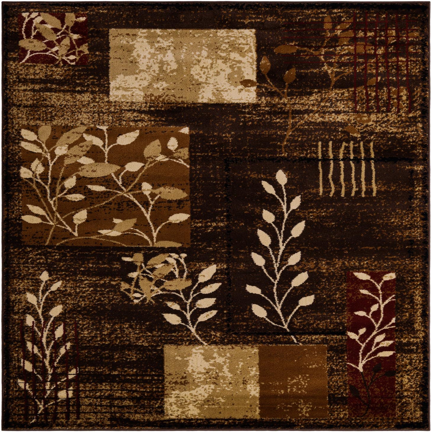 A 5x7 rectangular rug with a dark brown background, featuring abstract tan, beige, and reddish-brown blocks with delicate leaf and branch patterns.