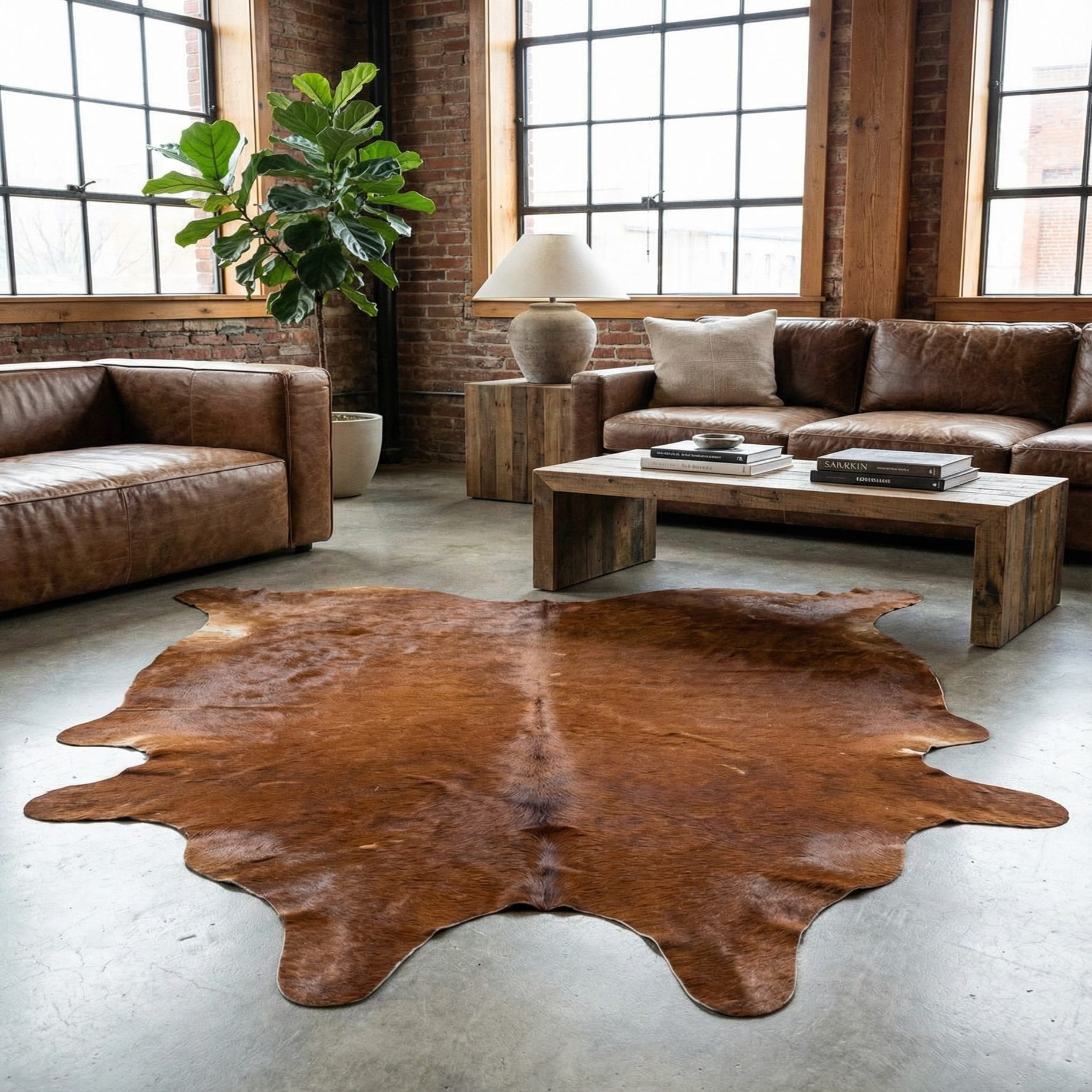 The hair-on-hide surface has a short, velvety nap with a slight sheen and a firm leather backing that adds structure underfoot. Its warm brown palette and tactile quality suit a range of interiors: layer it beneath a coffee table in a warm, rustic living room, anchor an industrial loft with softer textures, or place it beside a bed or favorite reading chair for added warmth and contrast. It pairs especially well with leather furniture, reclaimed wood, neutral linens, and warm metal accents.