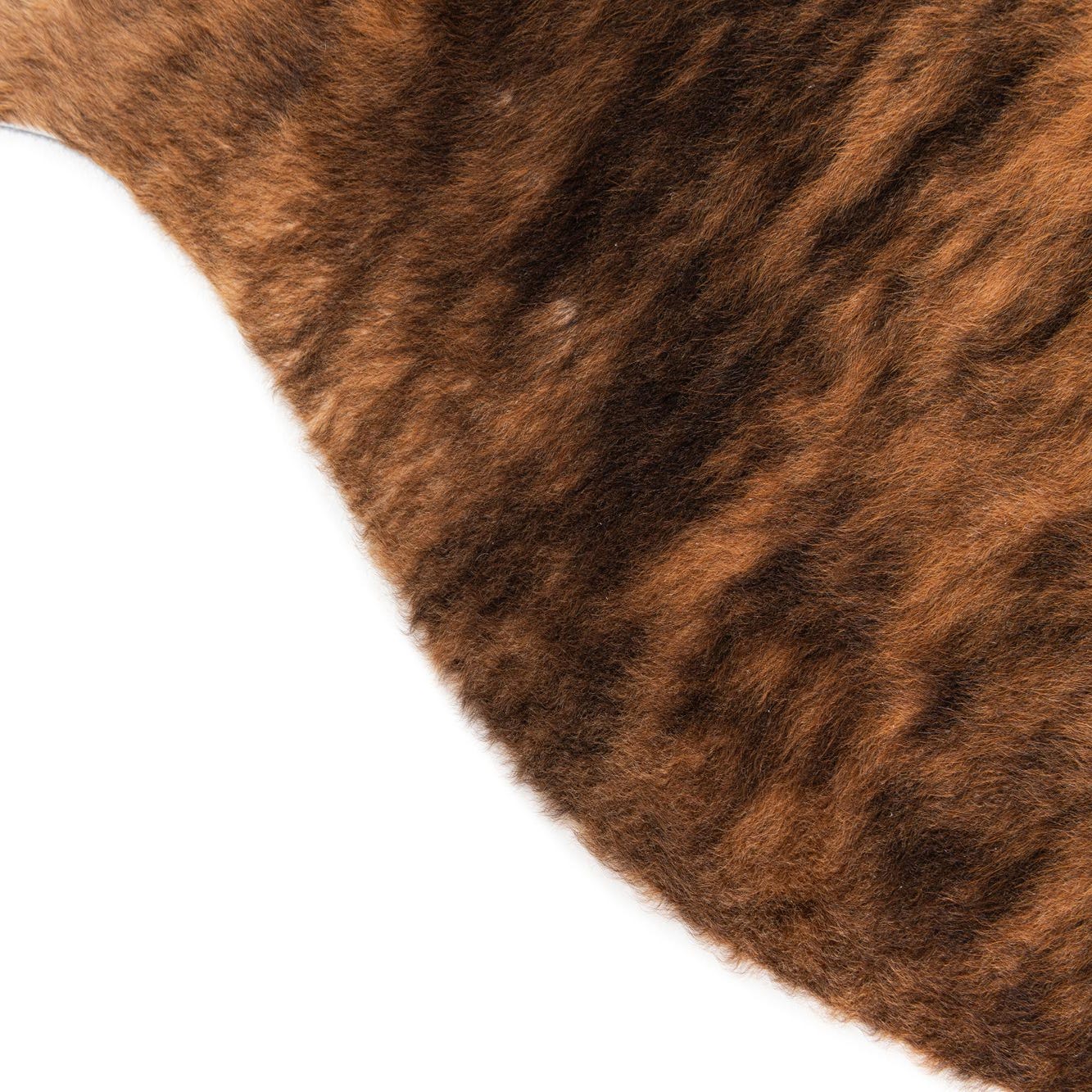 A 5x7 rectangular Cowhide Leather rug featuring natural brown and tan brindle patterns, ideal for an indoor living space.