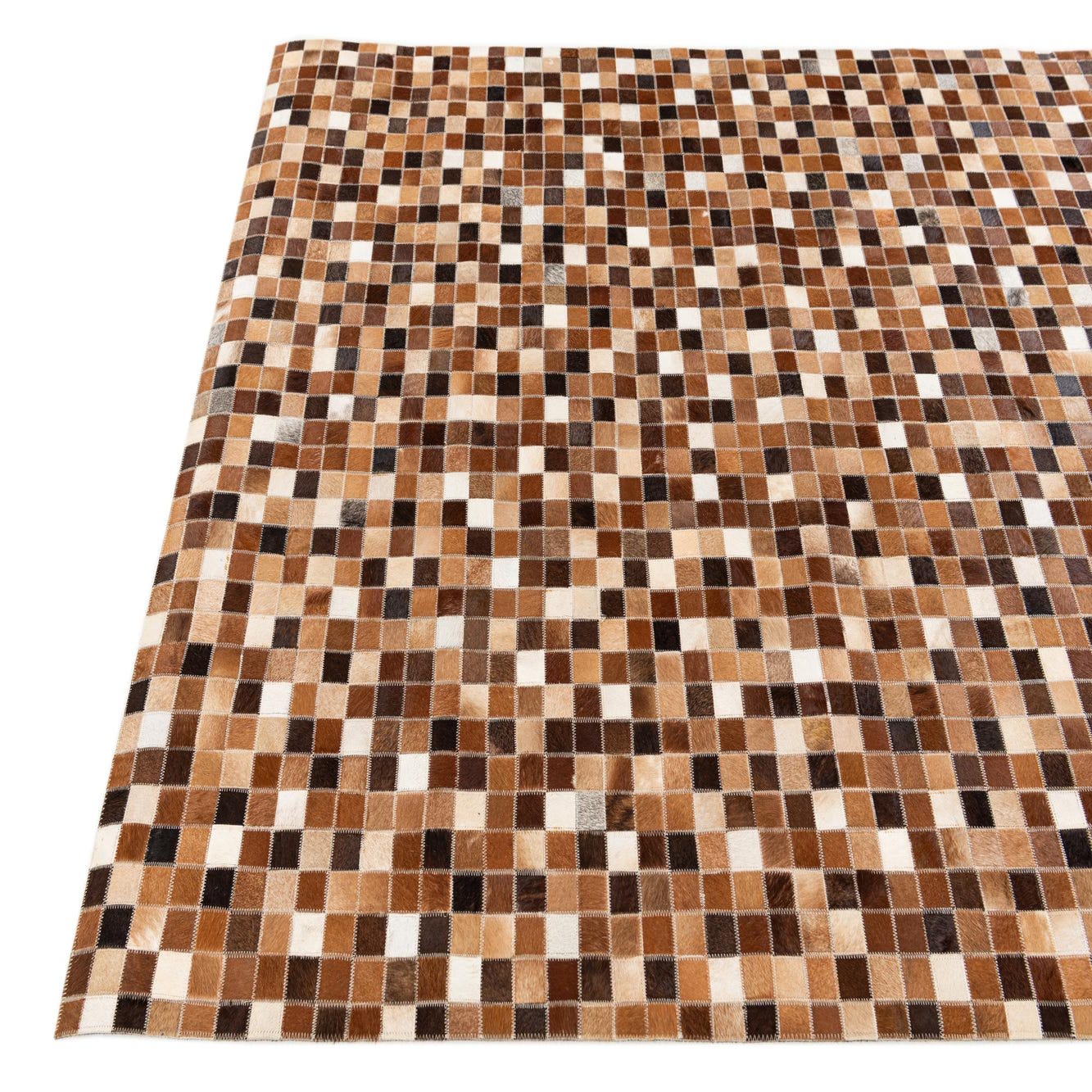 A rectangular 5x7 Cowhide Stocks rug featuring a modern patchwork of brown, tan, and white cowhide squares.