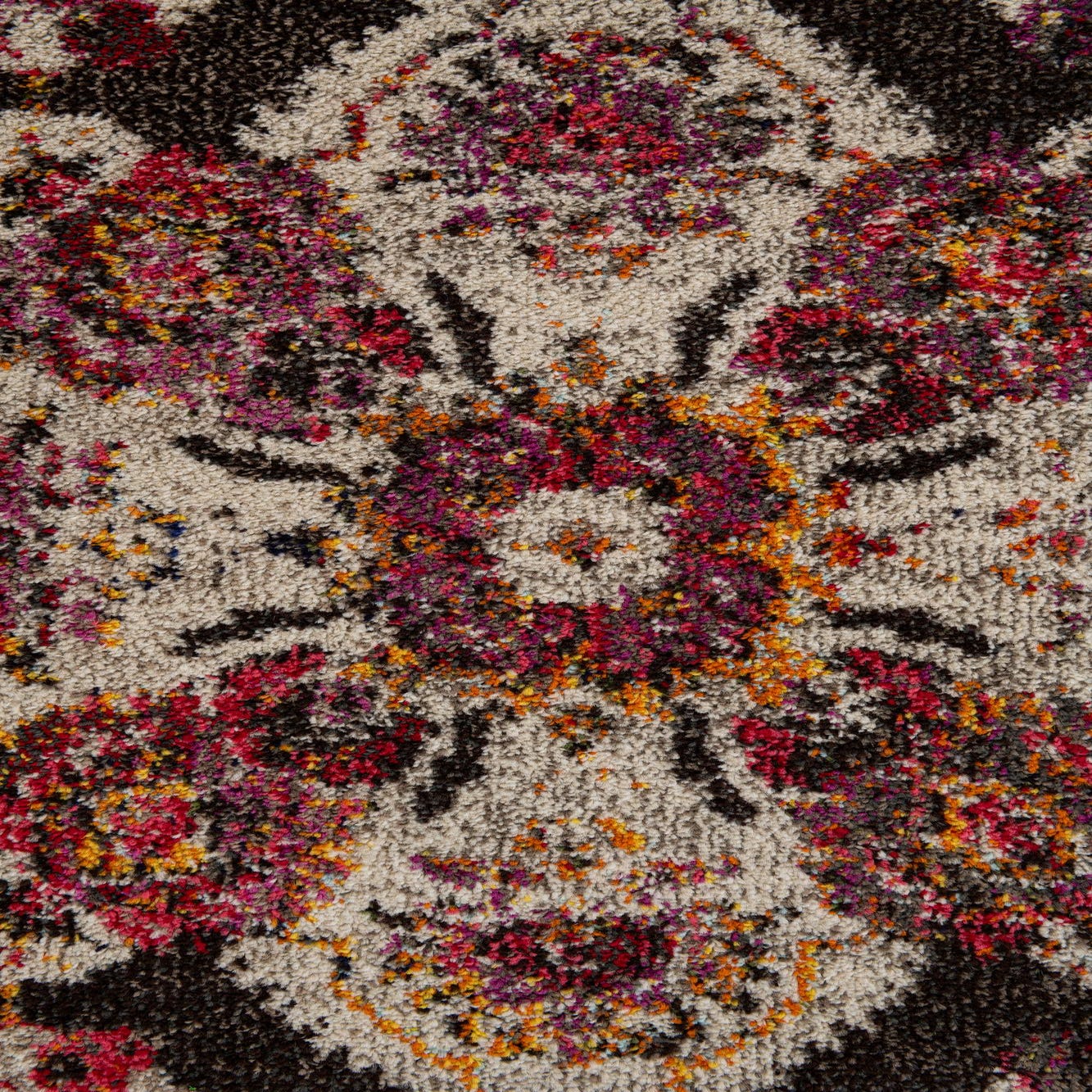 Primary color is Brown. Colors in this rug include: Brown, Beige, Gray, Ivory, Red, Yellow, Pink.