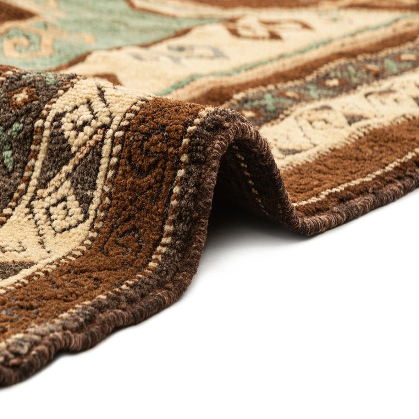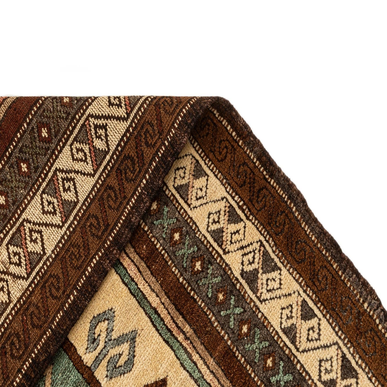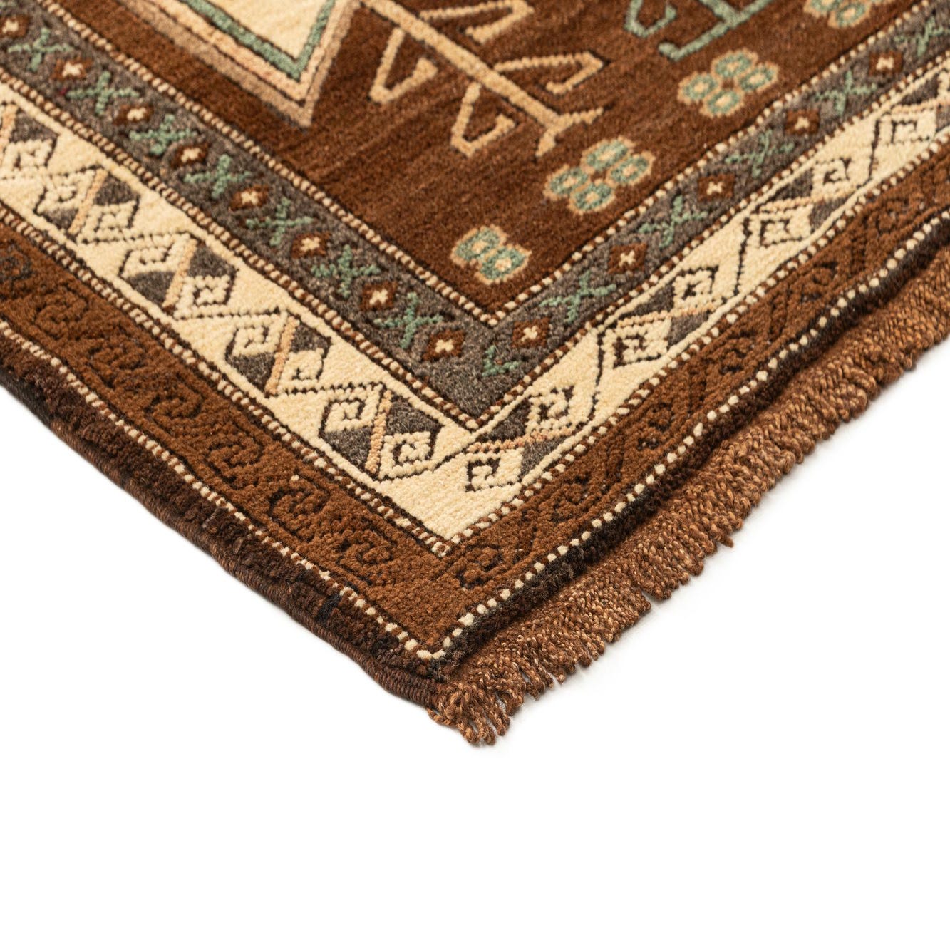 A 5x7 rectangular Kars rug featuring a complex tribal medallion pattern in rich browns, tans, and teal, with fringed ends.