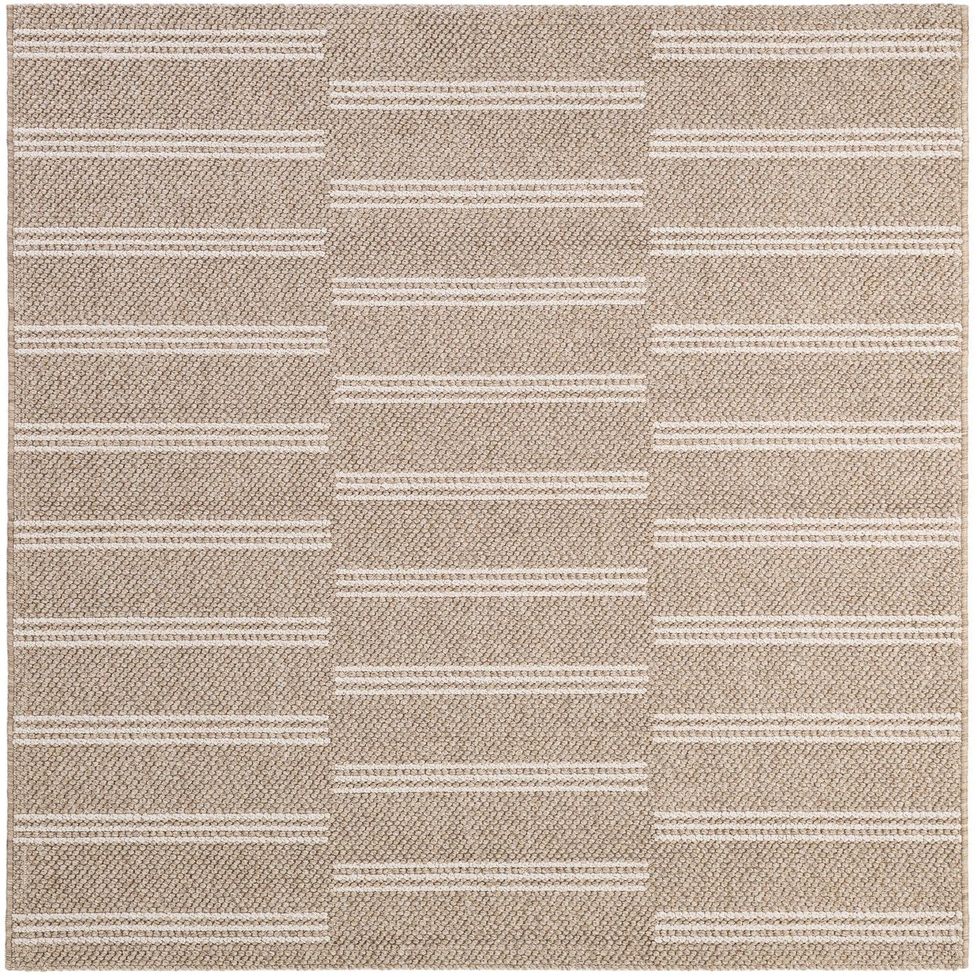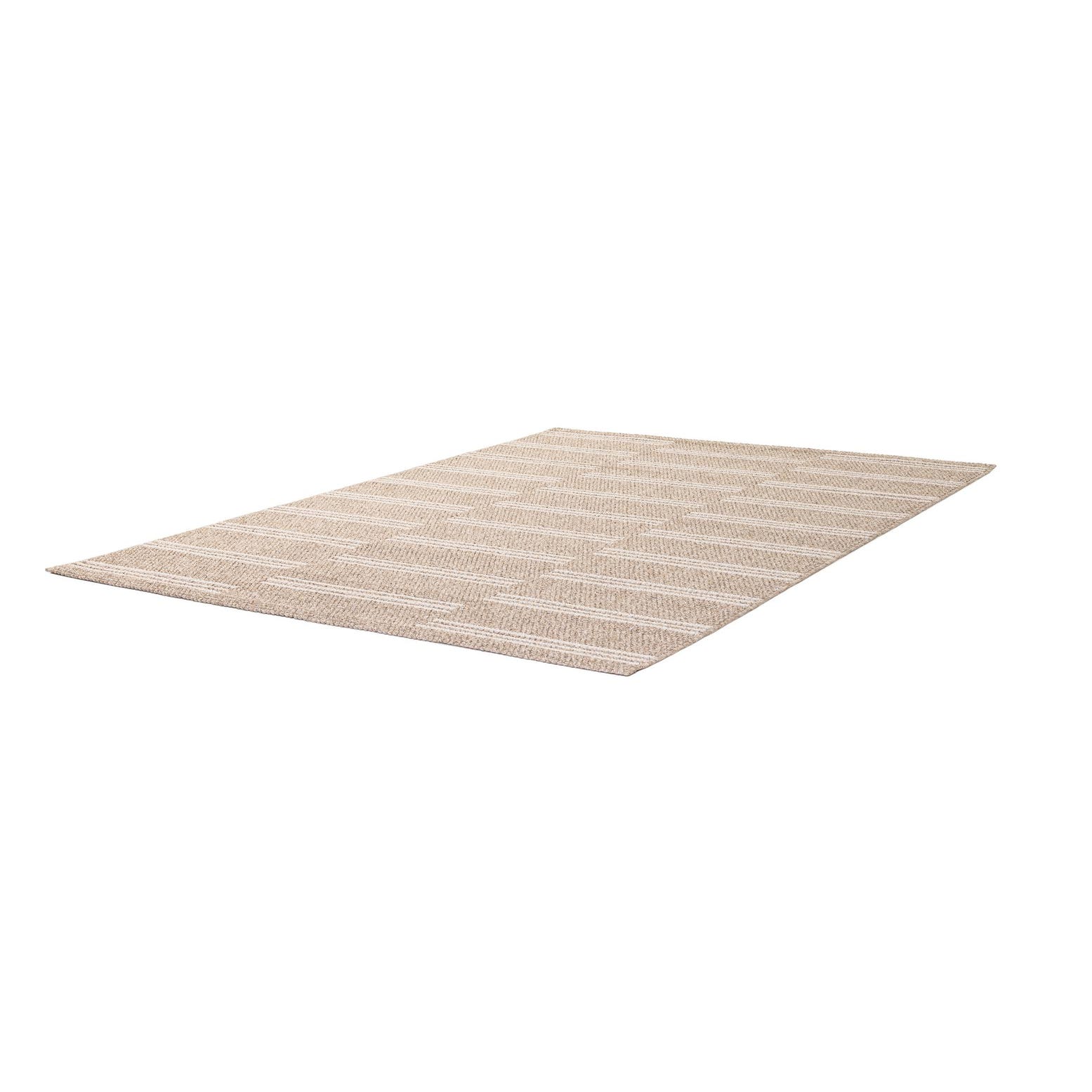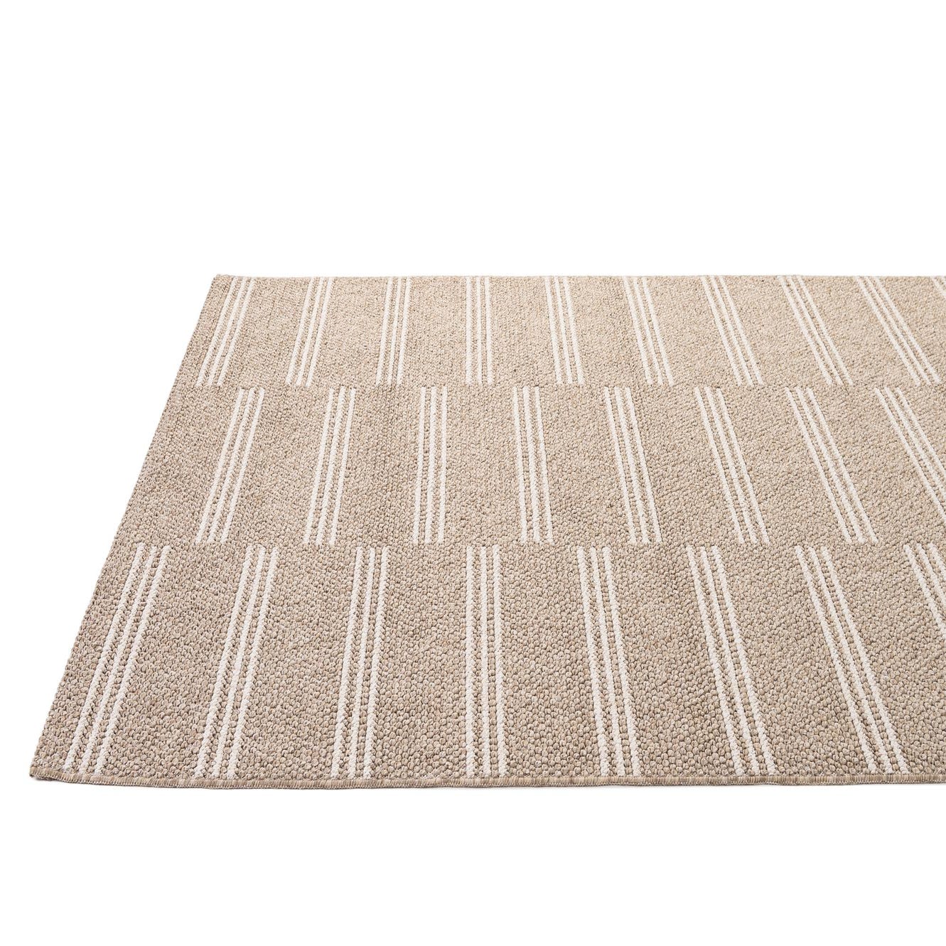 A 5x7 rectangular indoor rug with a modern stripe pattern in varying shades of brown and tan.
