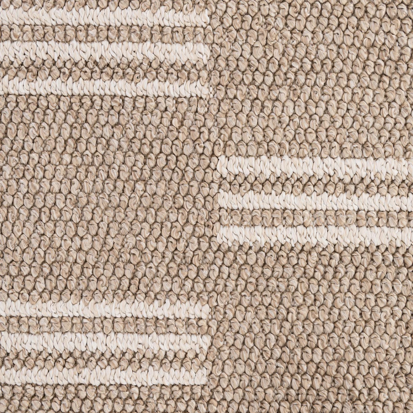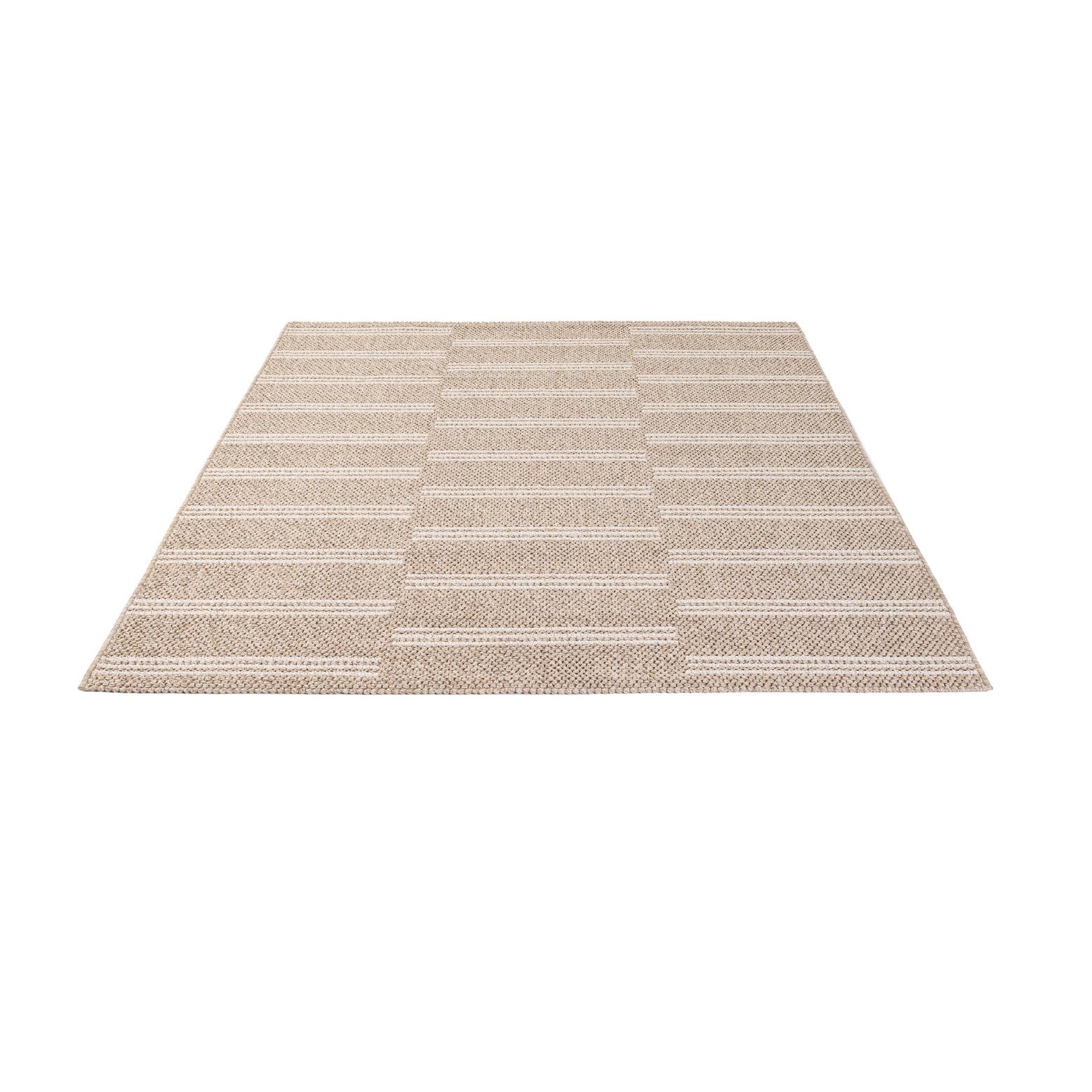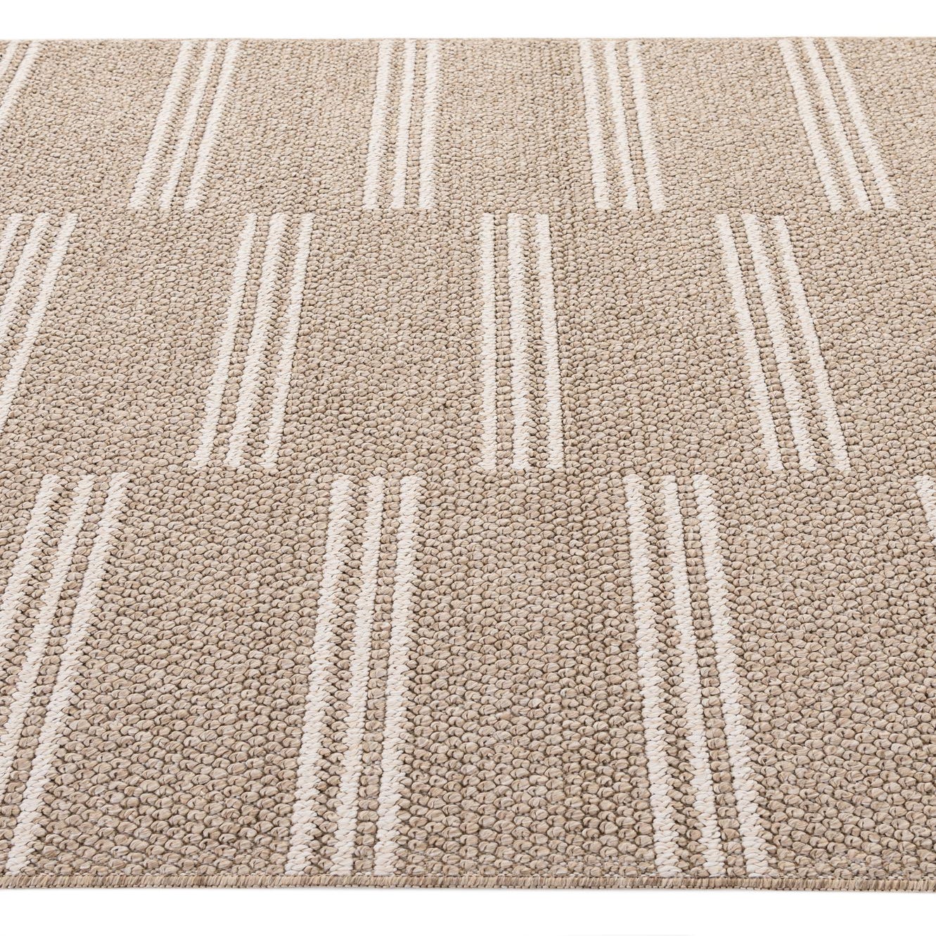 A 5x7 rectangular indoor rug with a modern stripe pattern in varying shades of brown and tan.