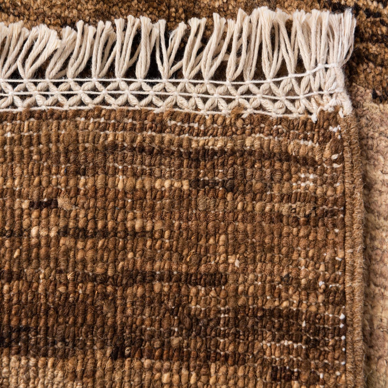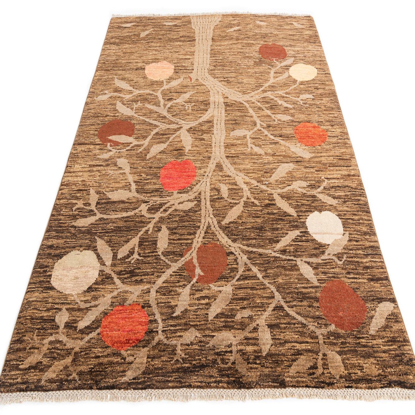 The rug showcases a stylized arboreal motif that is both organic and abstract, with branches and leaves unfurling across its surface in a muted yet complex array of shades. The earthy brown background provides a rich canvas for the accent colors of beige, light brown, red, and rust red which punctuate the pattern, adding depth and visual interest. Texturally, the wool's natural properties contribute a softness that is immediately palpable underfoot, highlighting the craftsmanship inherent in the rug's creation.