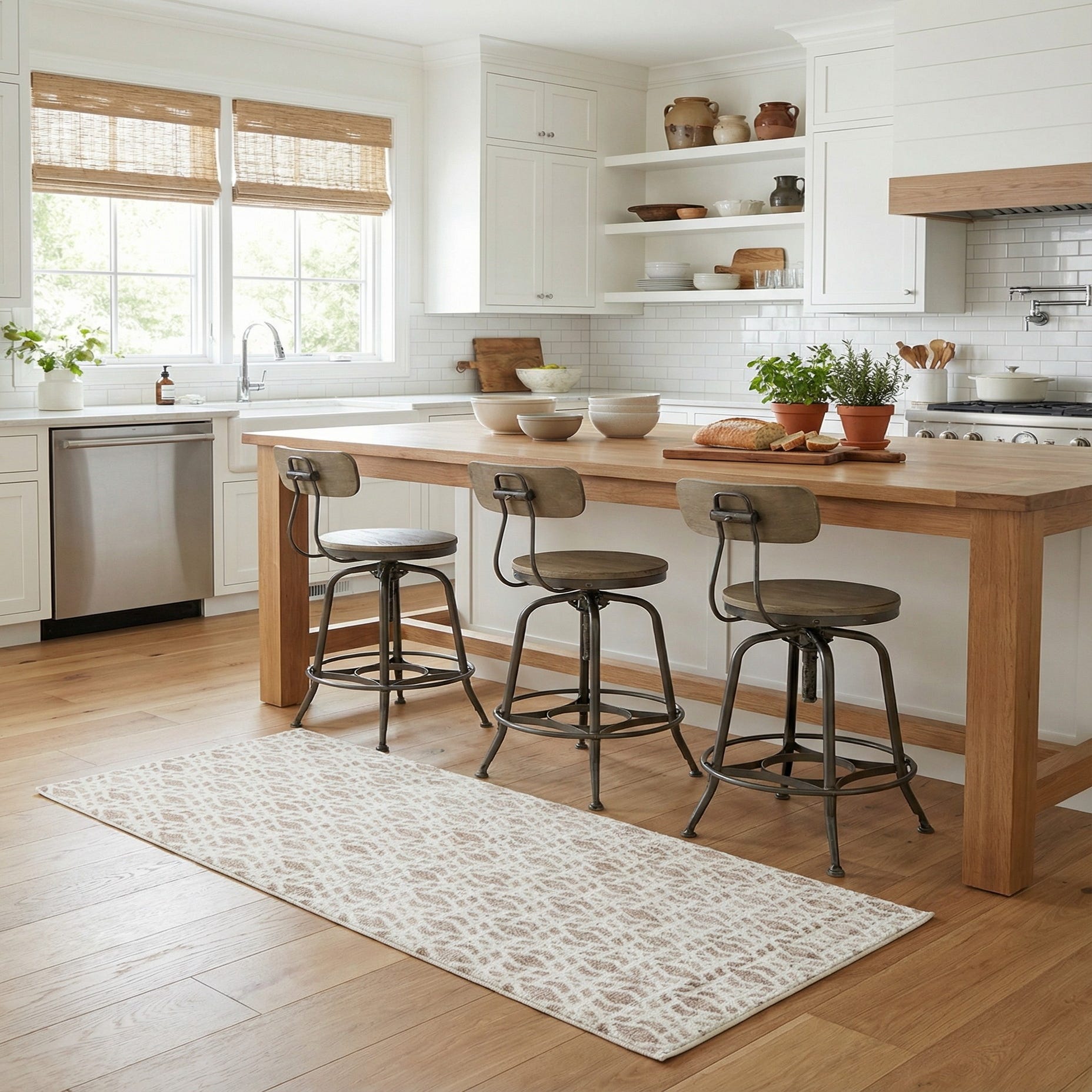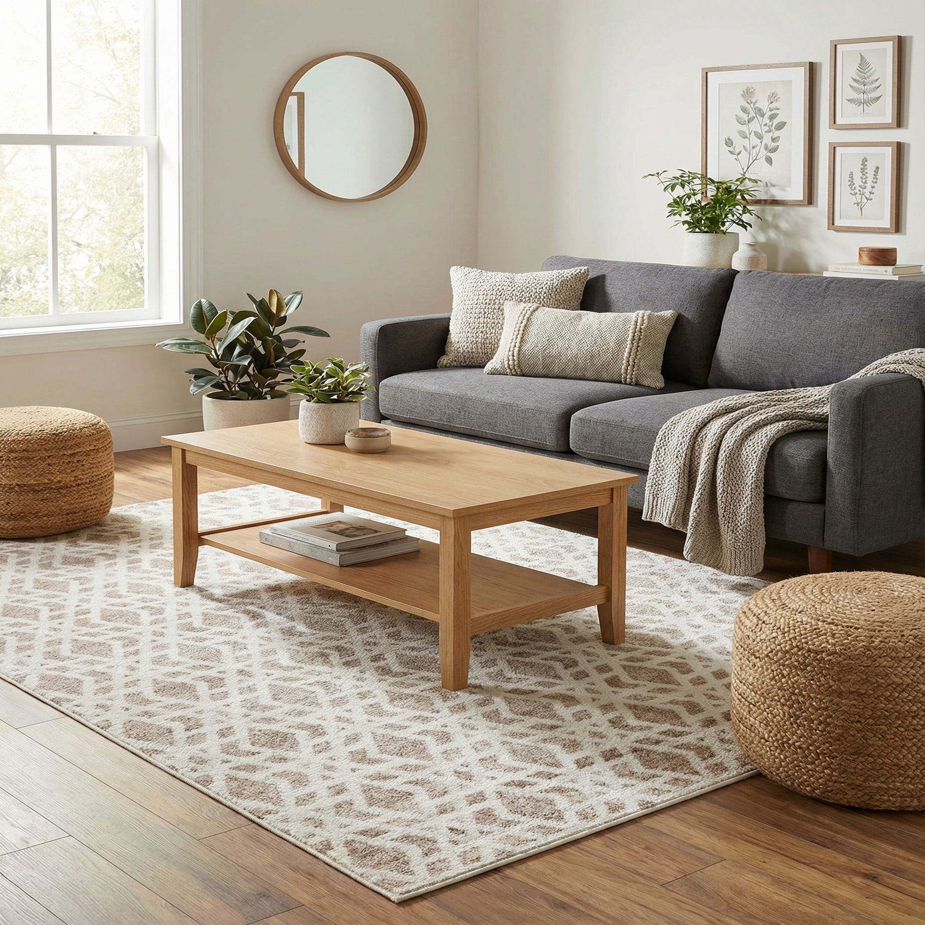 This piece suits living rooms, bedrooms, or a home office where a neutral base and gentle patterning are needed. It pairs well with warm wood tones and leather seating for a classic look, with ivory linens and light upholstery for a softer, contemporary feel, or with matte black metal accents in a modern transitional scheme. The restrained color palette and geometric pattern make it easy to layer with print throw pillows or textured blankets to complete the room.