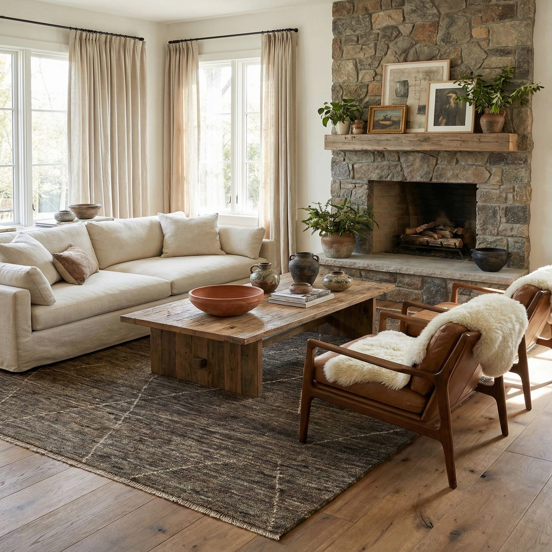 A 5x7 rectangular brown wool area rug with a subtle tribal diamond pattern, ideal for an indoor living space.