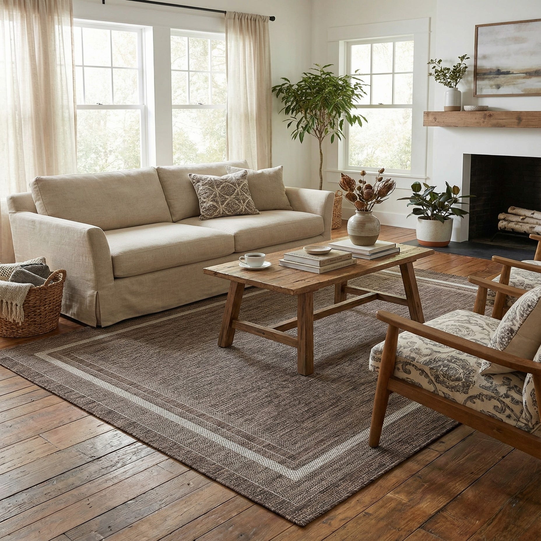 This rug suits covered patios, sunrooms, or a sheltered porch where neutral, grounded tones are wanted to tie seating areas together. It also works well inside in entryways, under a small dining set, or layered with natural-fiber furnishings—think rattan, teak, or leather—where the brown and beige palette complements wood and warm metal finishes. The understated border provides definition without dominating a space, making it a versatile choice for transitional, coastal, or modern-rustic interiors.