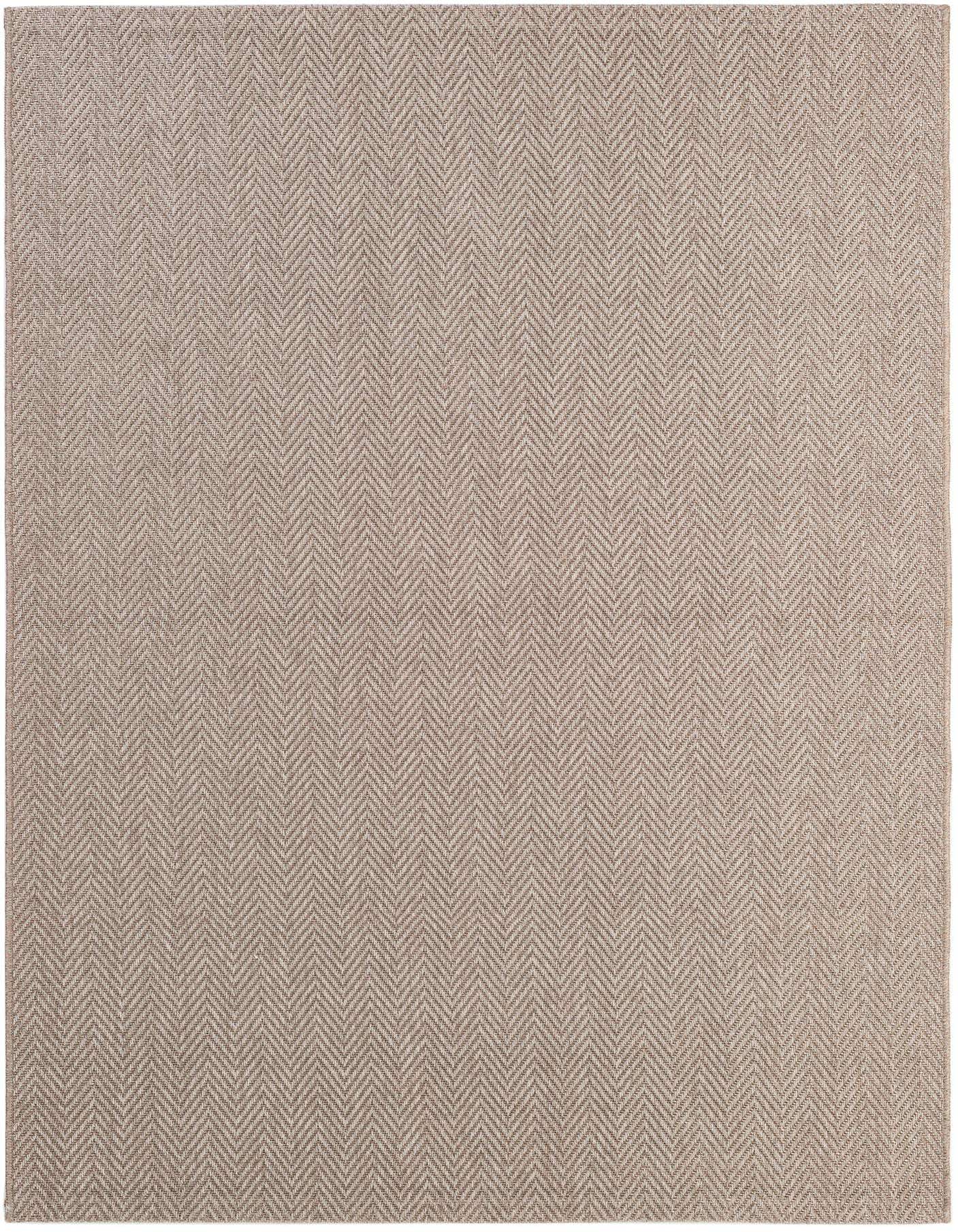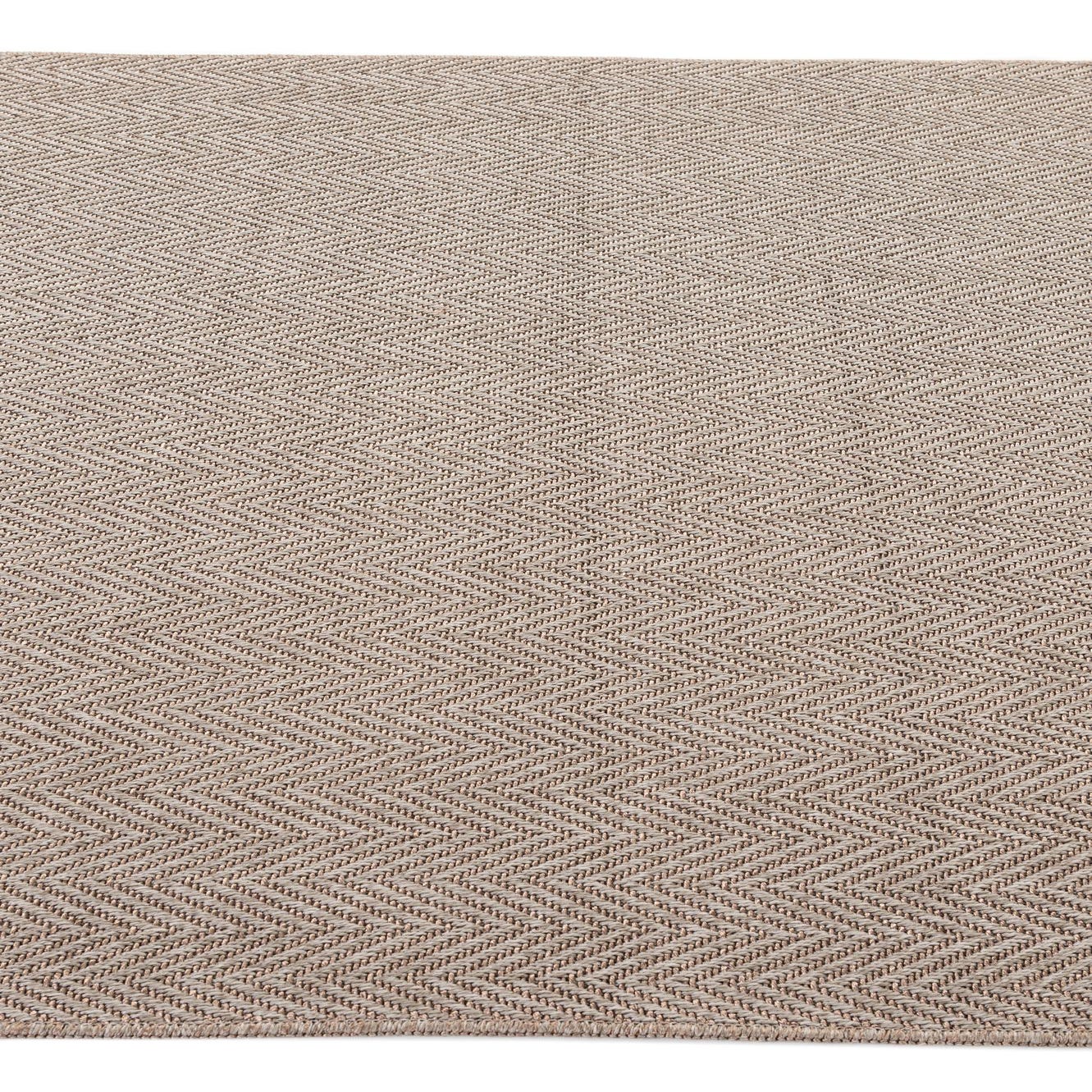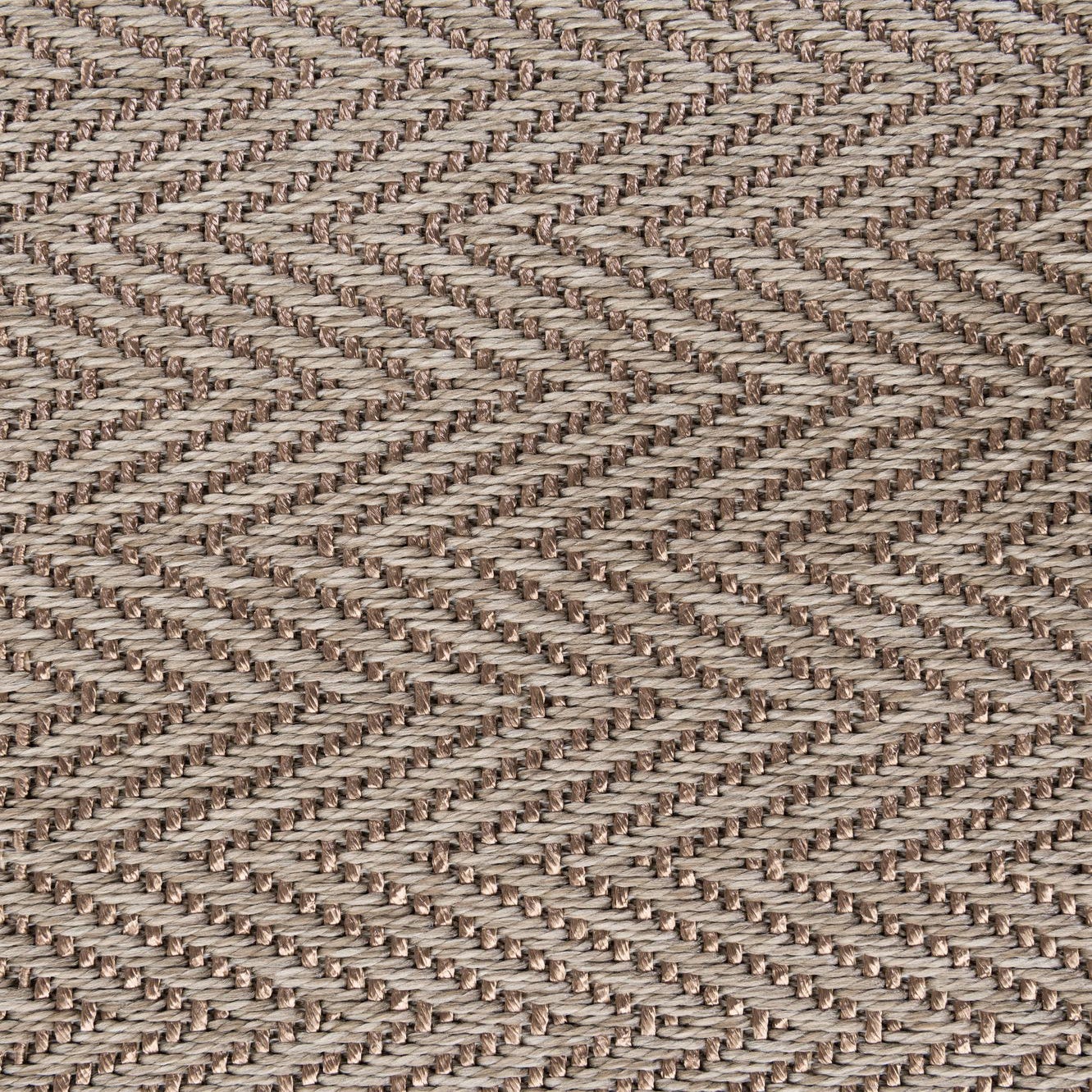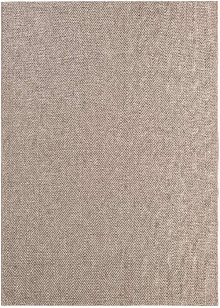 A 5x7 rectangular indoor/outdoor rug with a subtle brown and tan modern herringbone pattern, suitable for a patio.