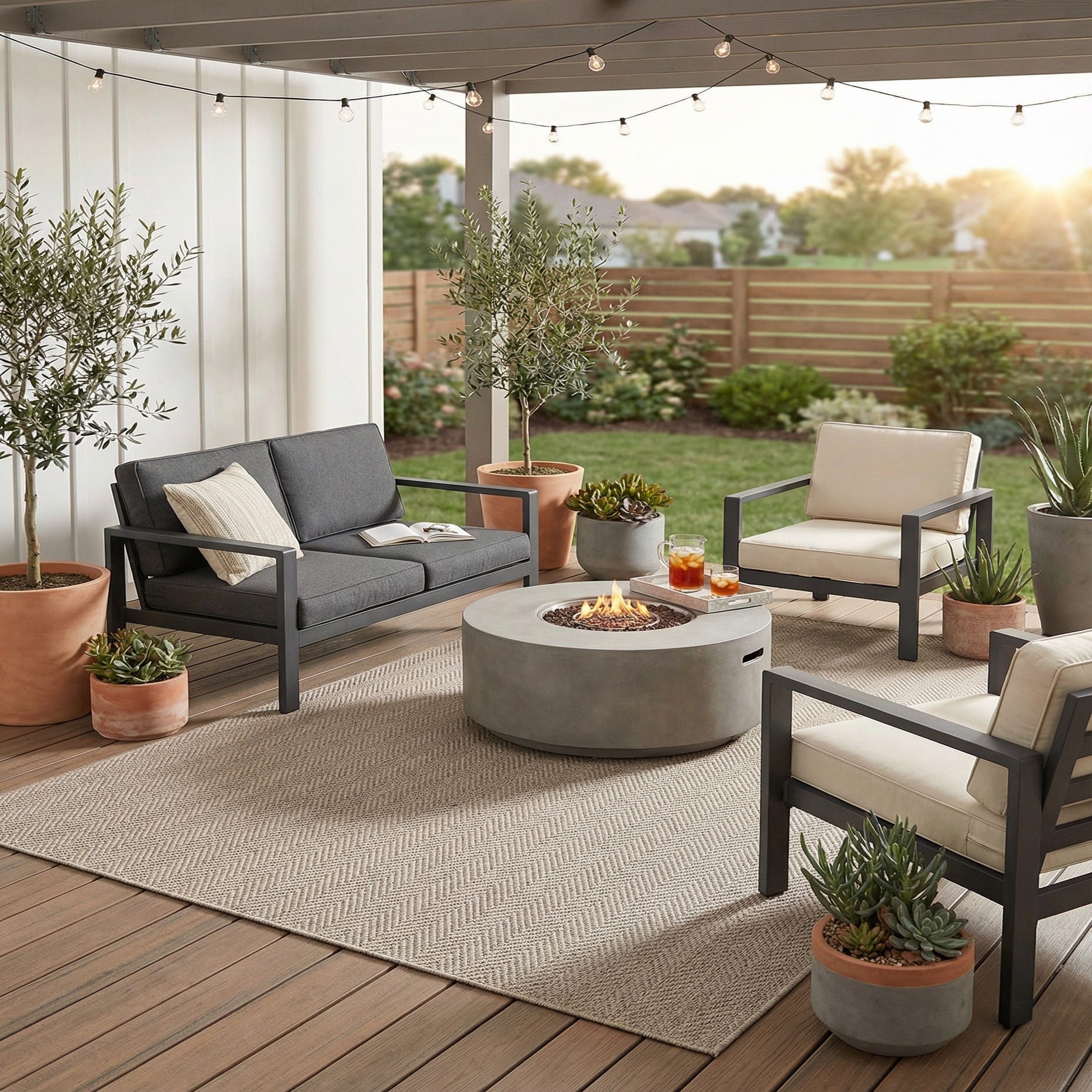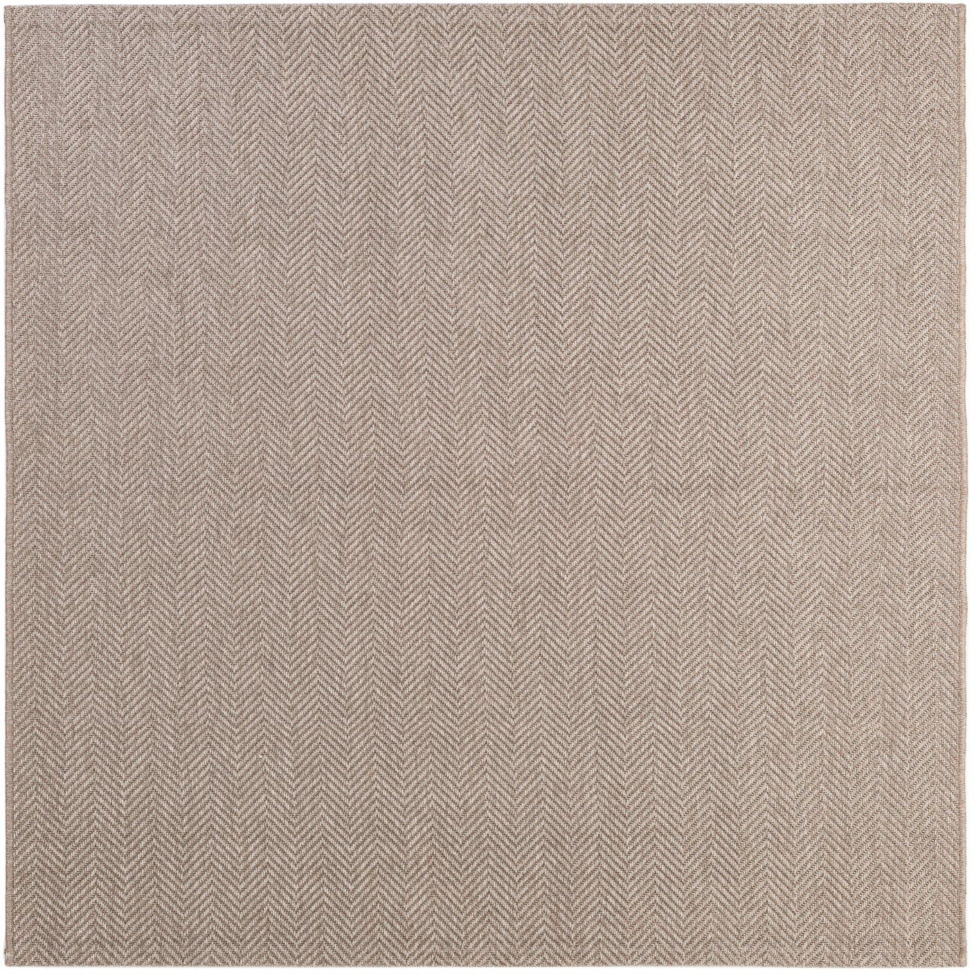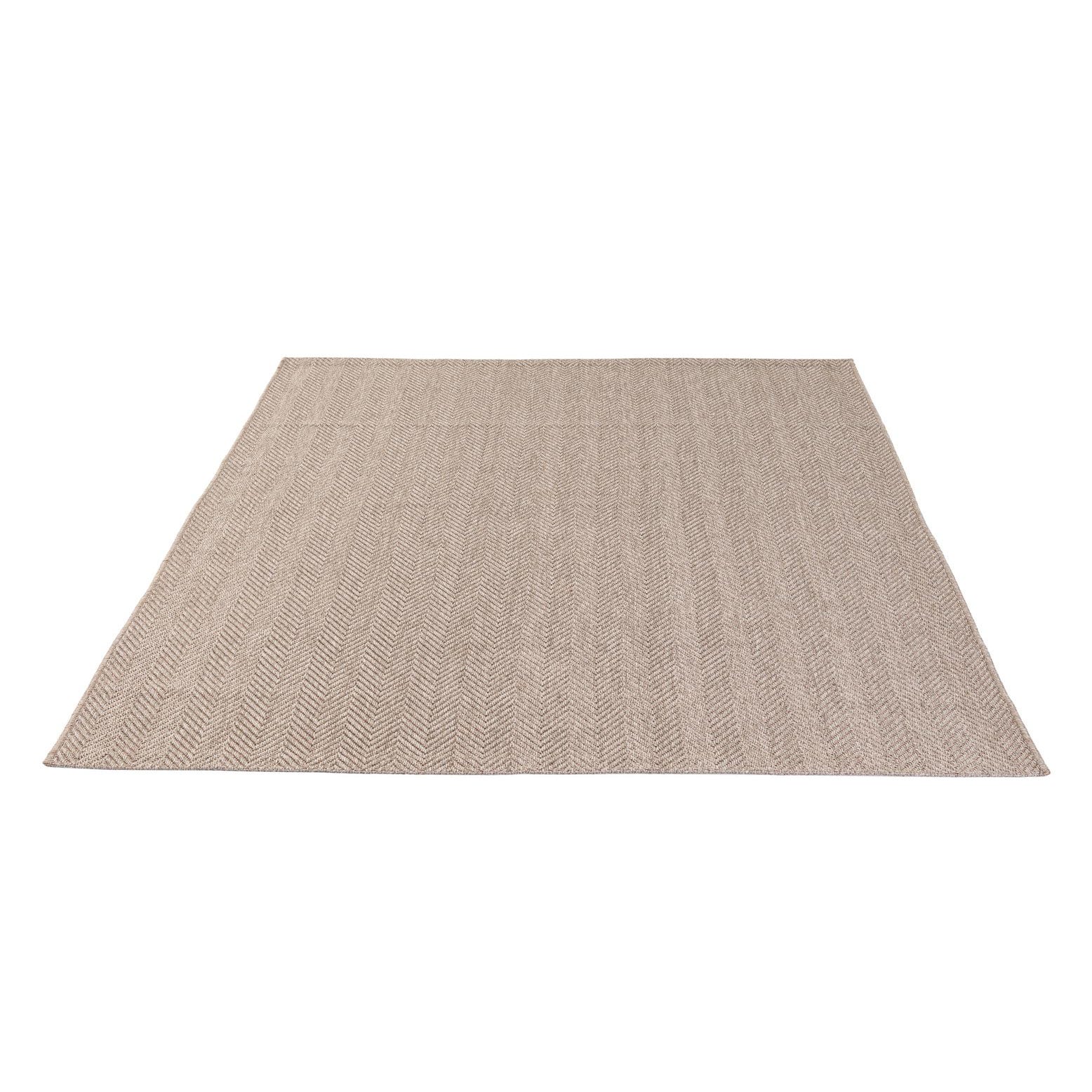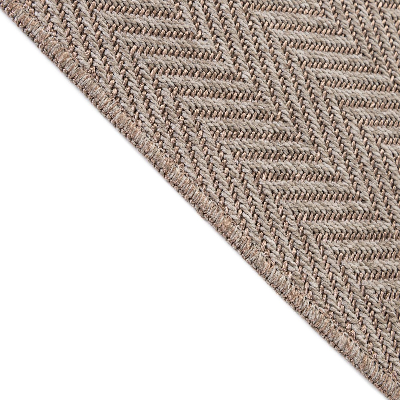 A 5x7 rectangular indoor/outdoor rug with a subtle brown and tan modern herringbone pattern, suitable for a patio.