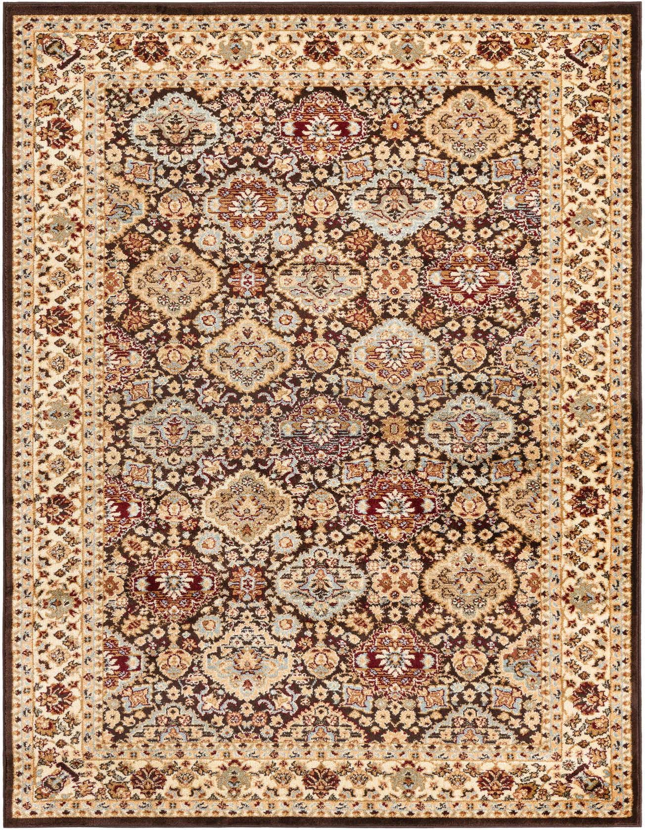 The Aditi collection presents a machine-woven 5x8 rug crafted from 100% polypropylene, offering a blend of durability and soft texture. The rug features a brown background with an intricate pattern that incorporates a harmonious mix of colors including cream, light blue, light green, red, tan, and peach. The detailed design suggests a traditional aesthetic with a modern color palette, ideal for bringing warmth and complexity to an interior space.