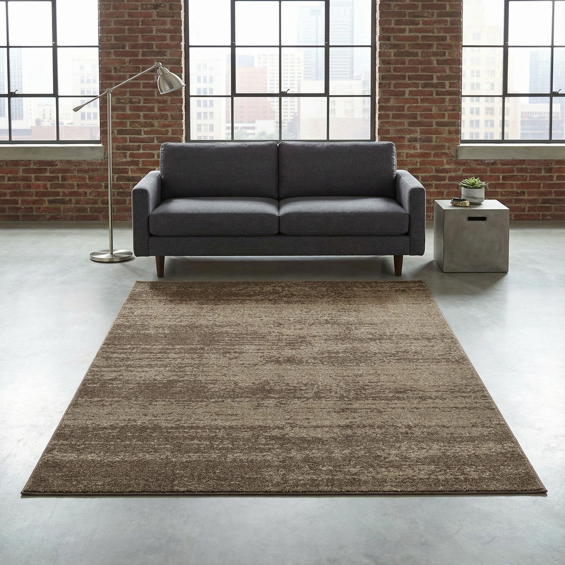 The Angelica collection offers a versatile 5x8 area rug that combines durability with contemporary styling. Machine-woven from 100% polypropylene, this piece features a rich brown background with subtle beige highlights, presenting a harmonious gradient effect that adds depth and texture to your floor. The rug's pile is designed to provide a soft, comfortable underfoot feel, while its stain-resistant properties ensure long-lasting appeal and easy maintenance.