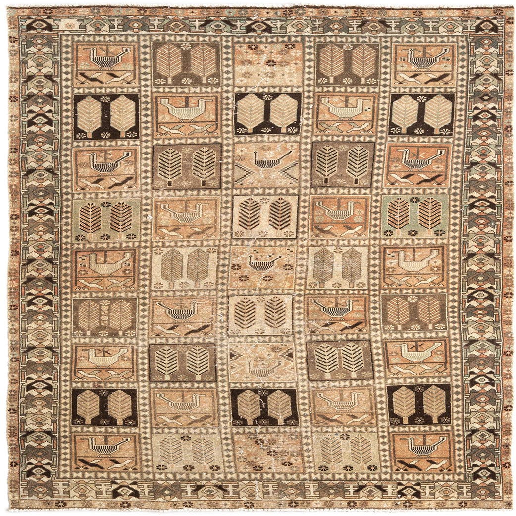 A 5x8 rectangular Bachtiar Persian wool rug in browns and tans, featuring a grid pattern of trees and birds.