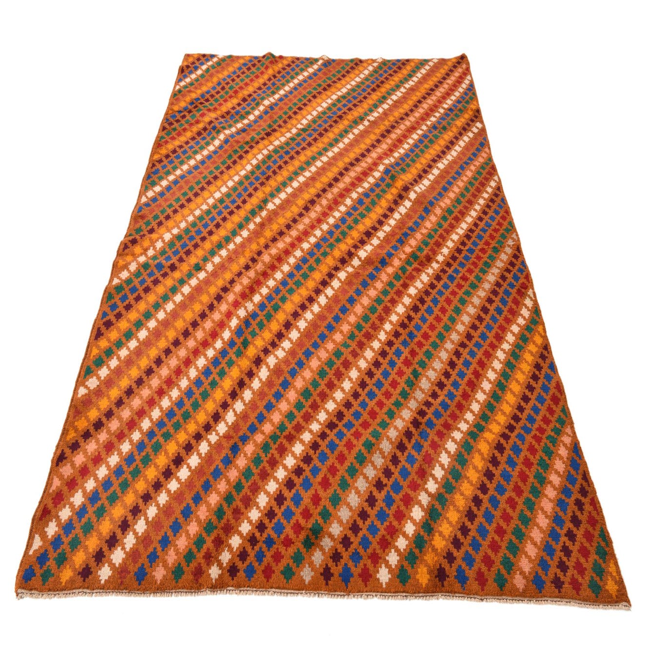 A rectangular 5x8 Balouch rug with a tribal modern pattern in shades of brown, tan, red, blue, and green, featuring diagonal stripes of small colorful diamonds.