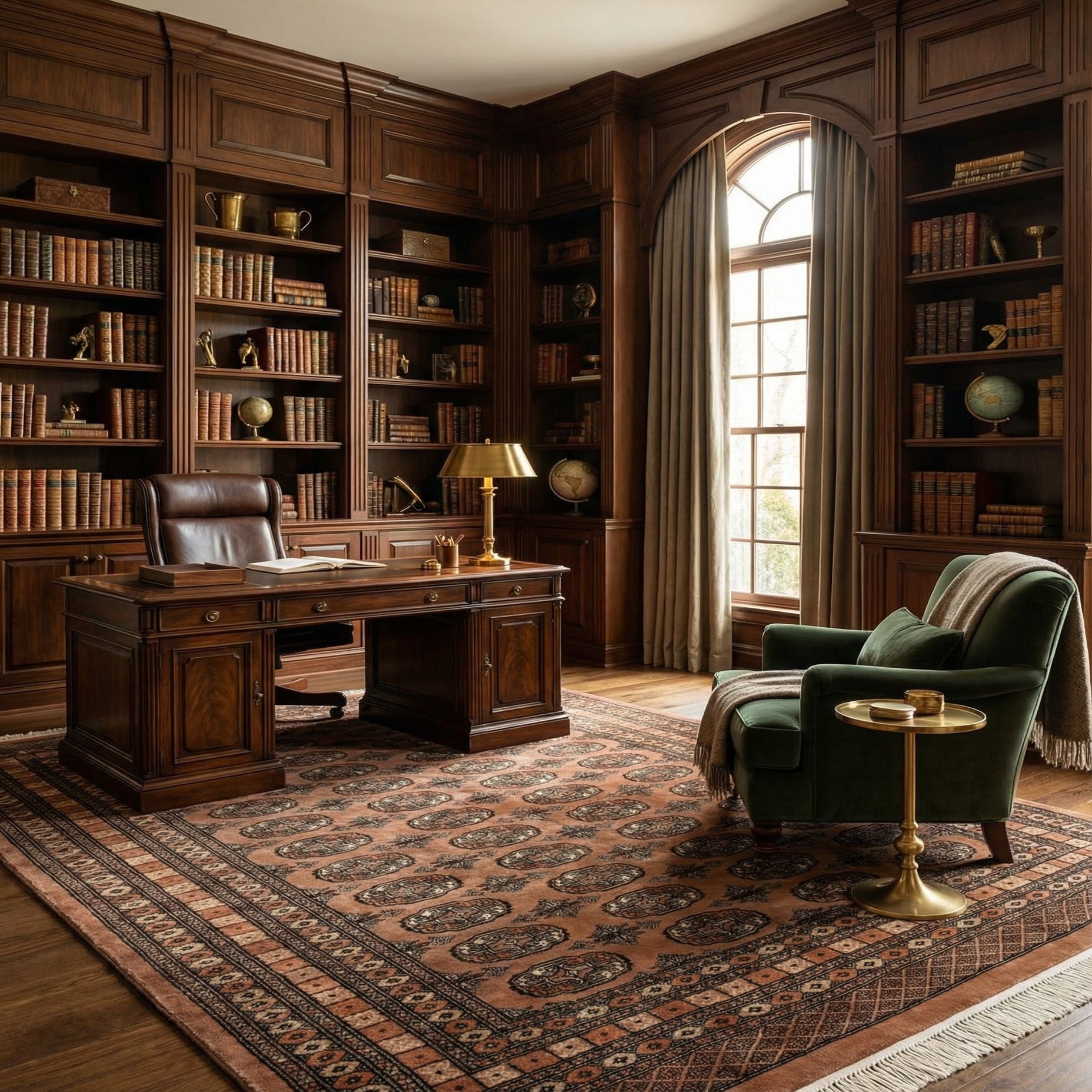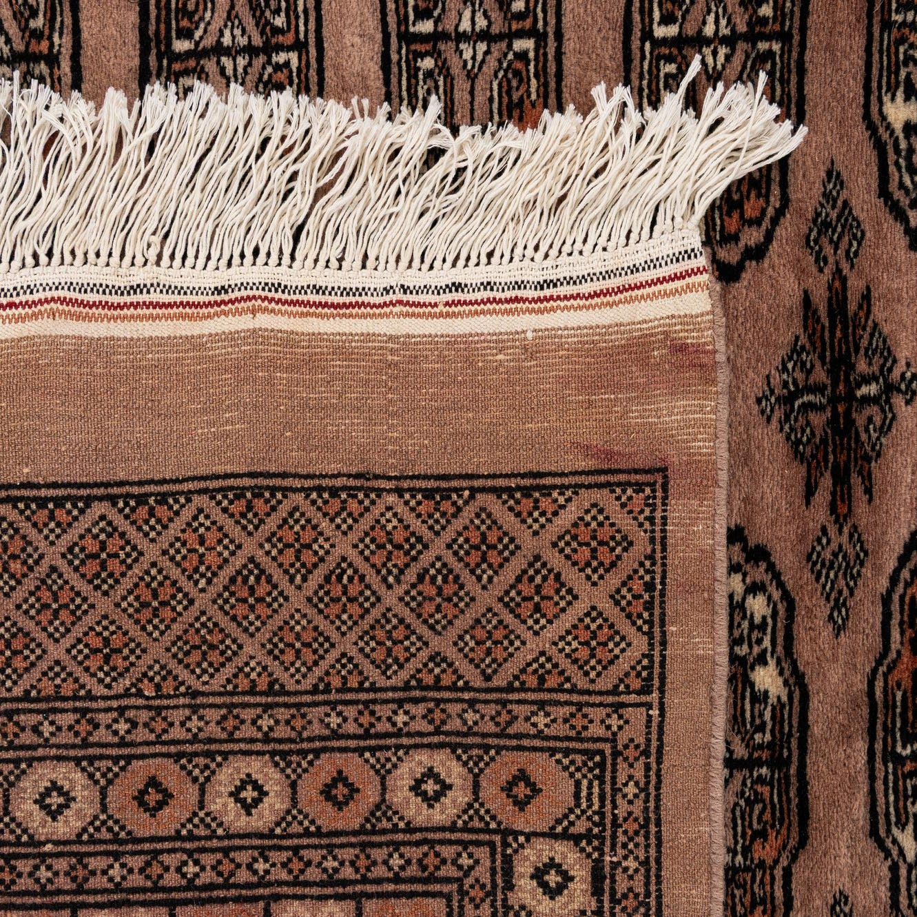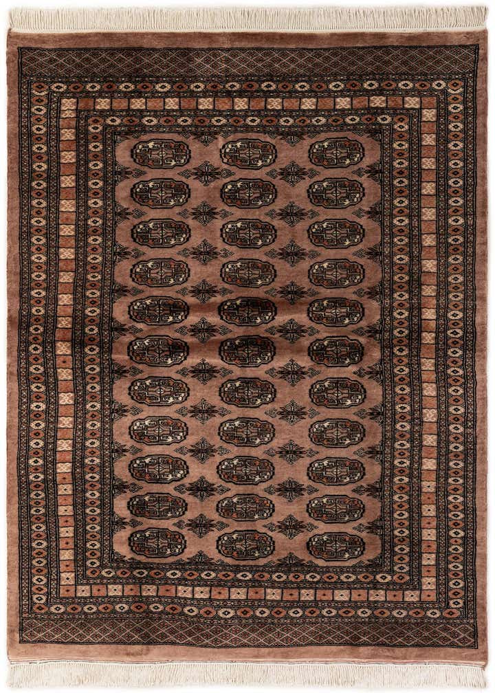 A 5x8 rectangular Bokhara rug in shades of brown and tan, featuring a tribal oriental pattern with geometric medallions and a detailed border.