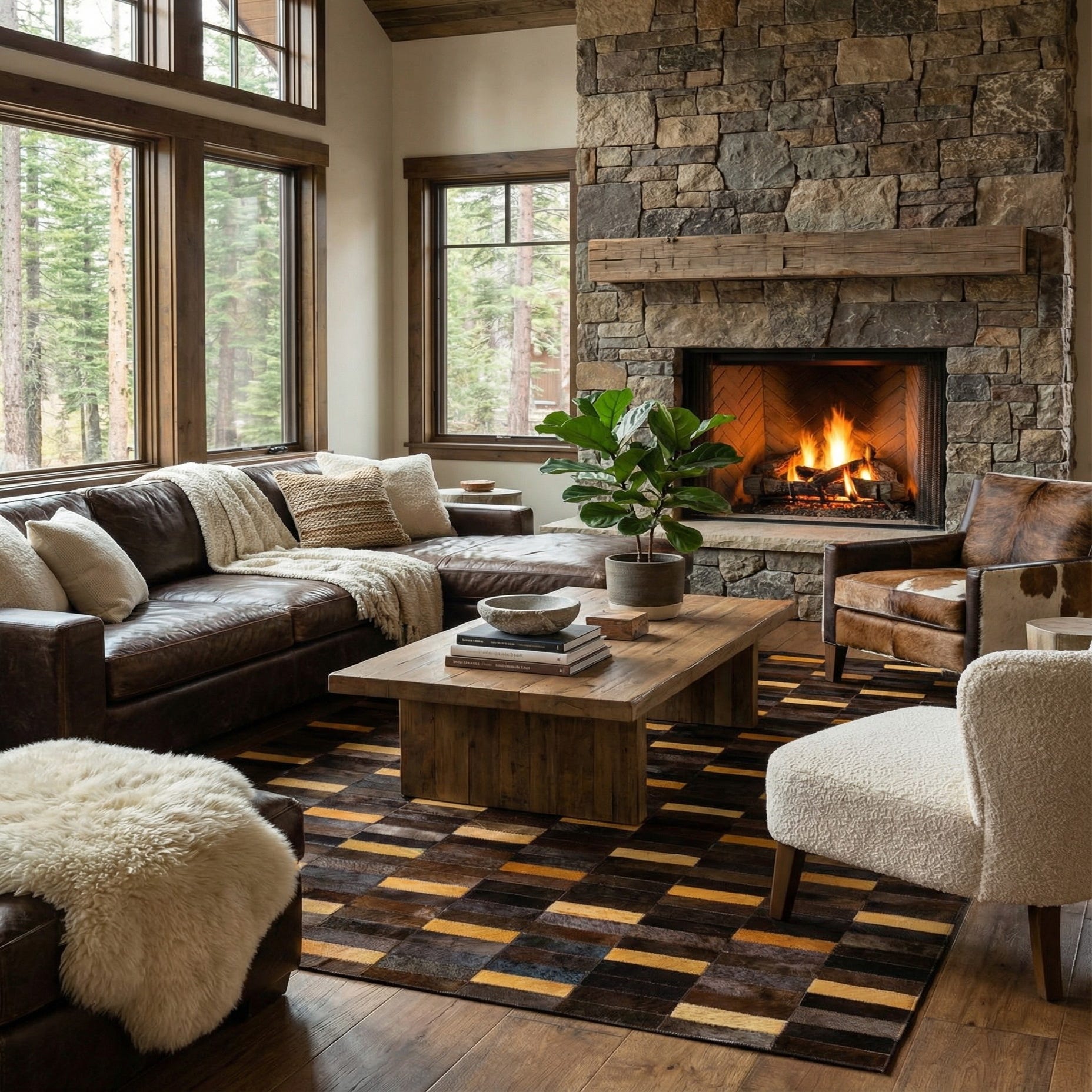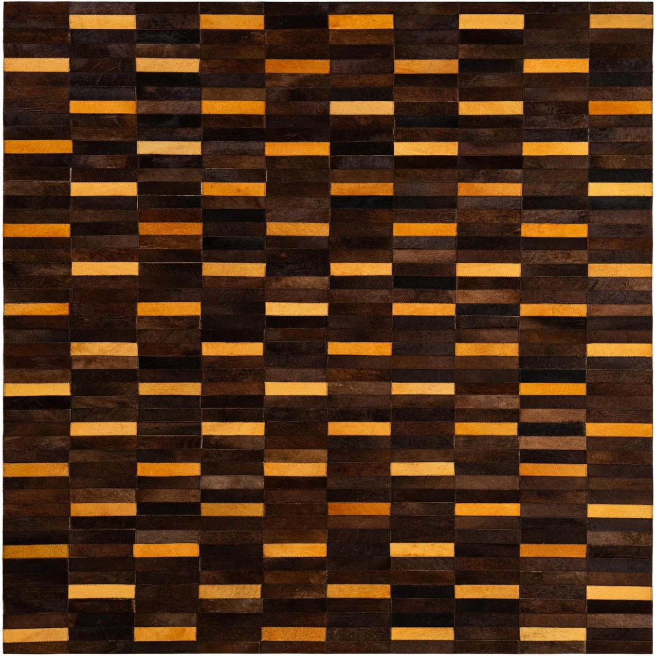 A 5x8 rectangular Cowhide Patchwork rug featuring a modern stripe pattern in varying shades of brown and tan.