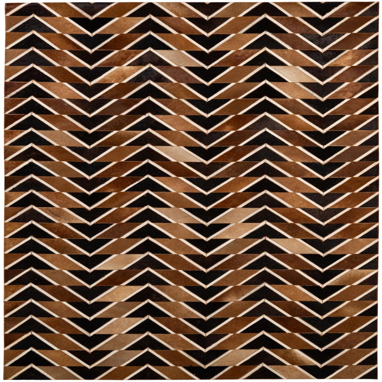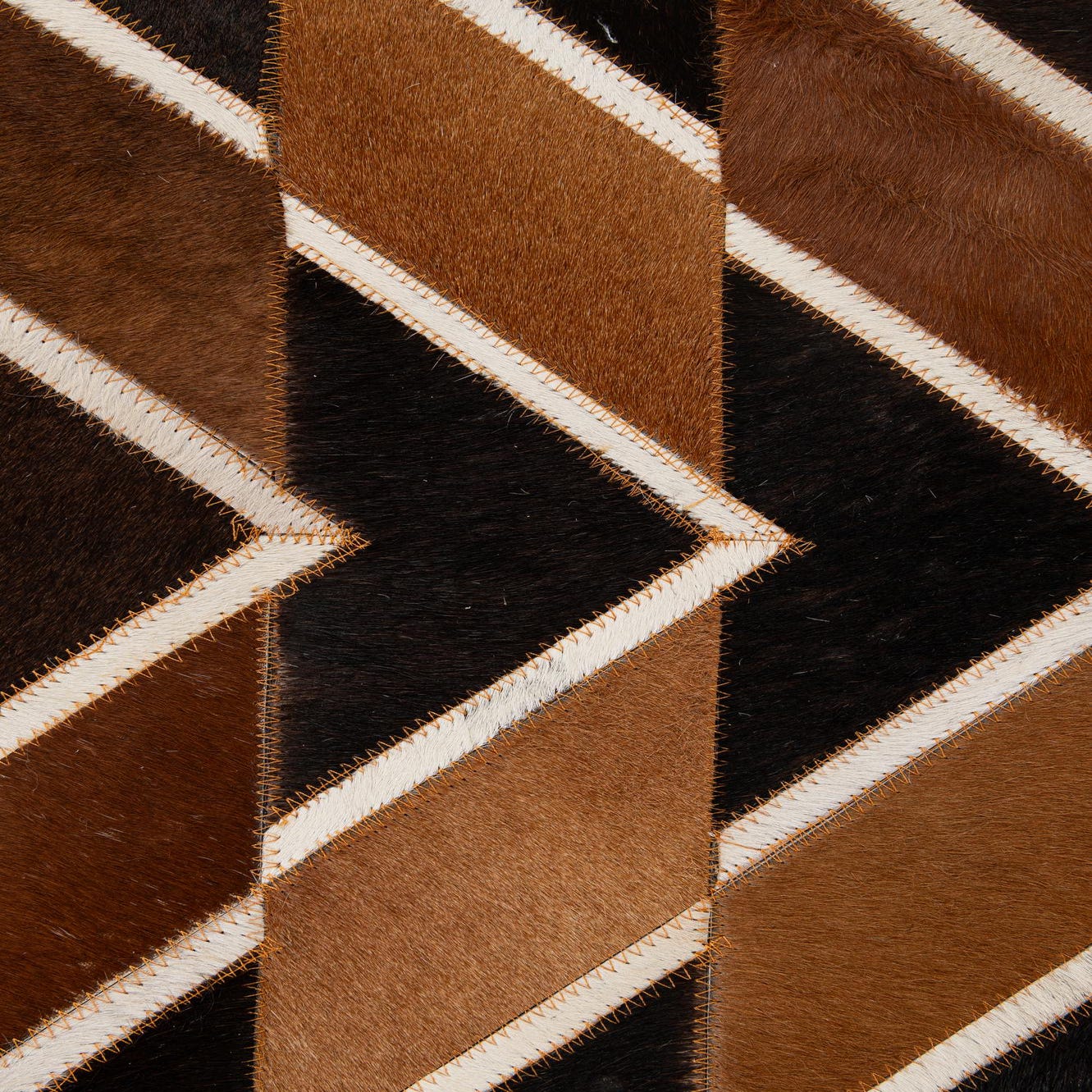 A rectangular 5x8 brown cowhide rug with a modern chevron pattern in varying shades of brown, tan, and black.