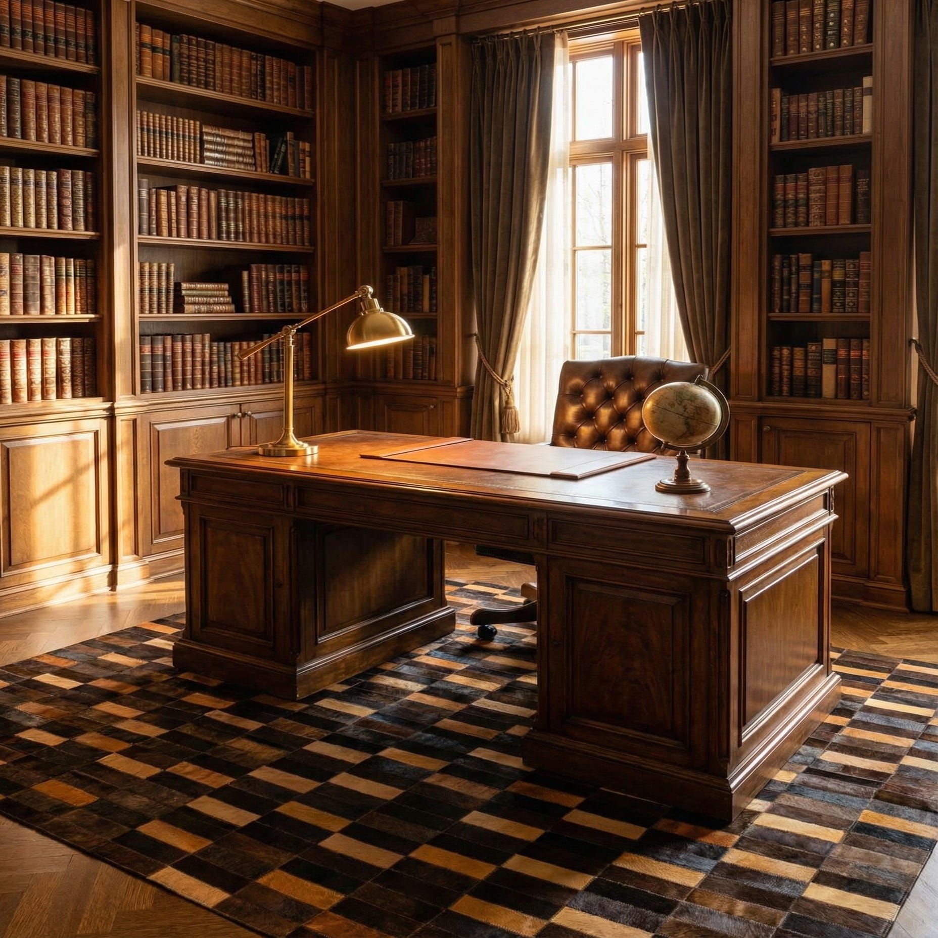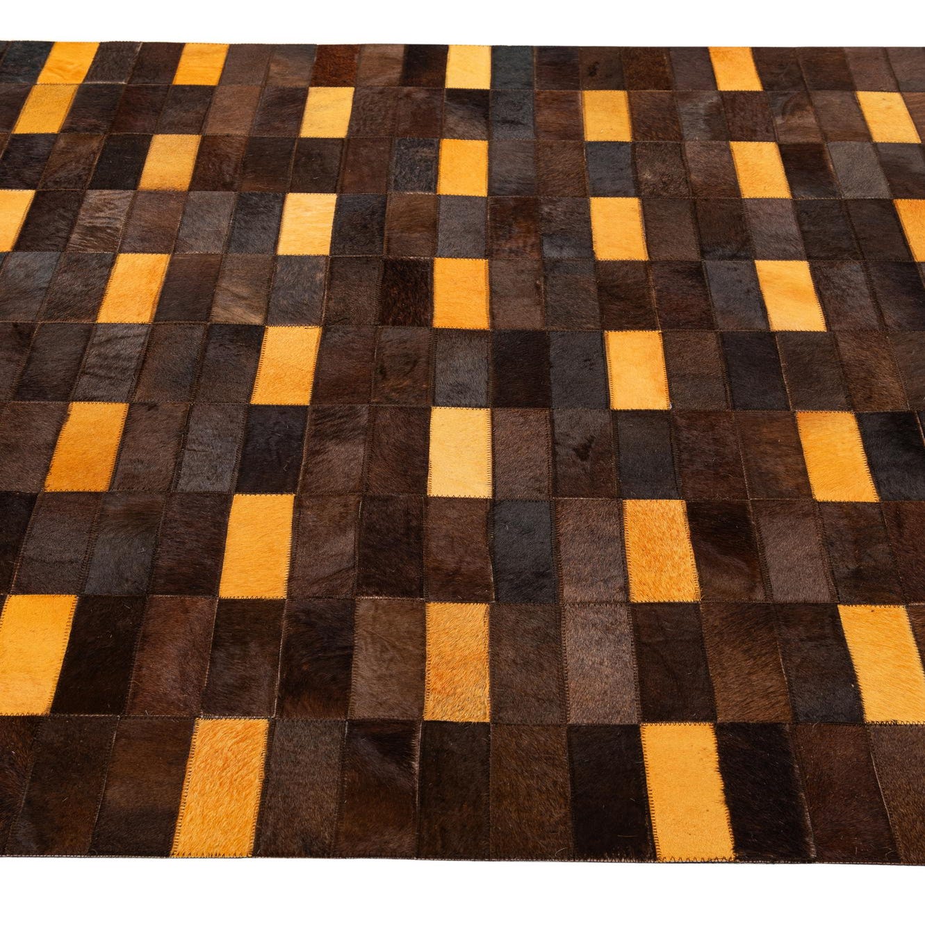 A 5x8 rectangular Cowhide Patchwork rug featuring a modern stripe pattern in varying shades of brown and tan.