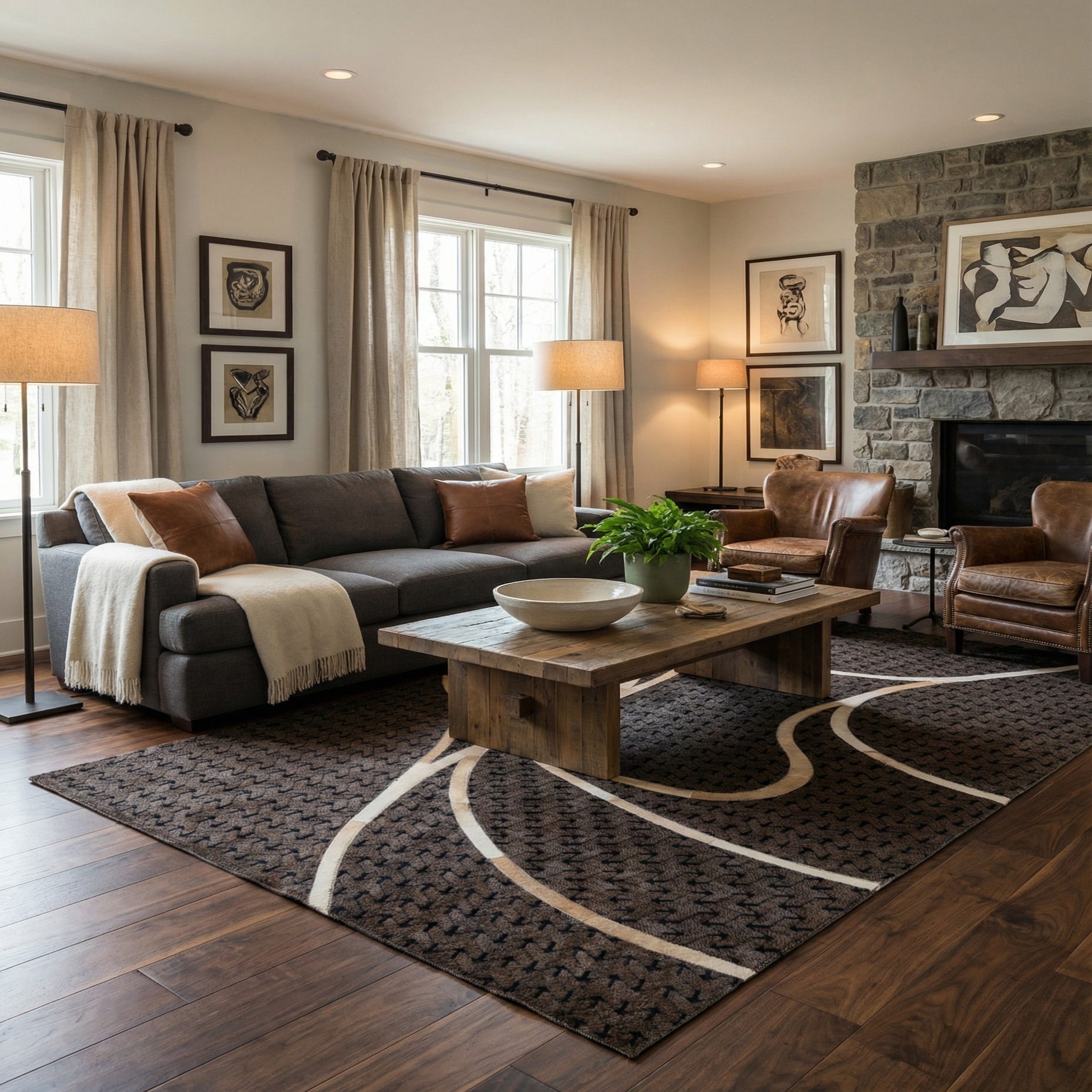 Primary color is Brown. Colors in this rug include: Brown, Black, Ivory, Light Brown.
