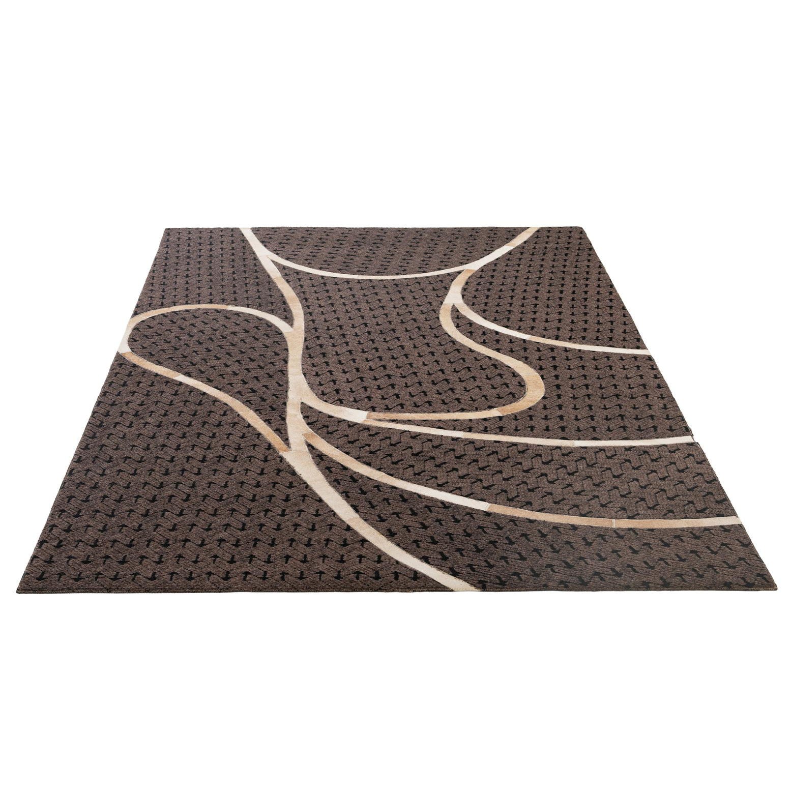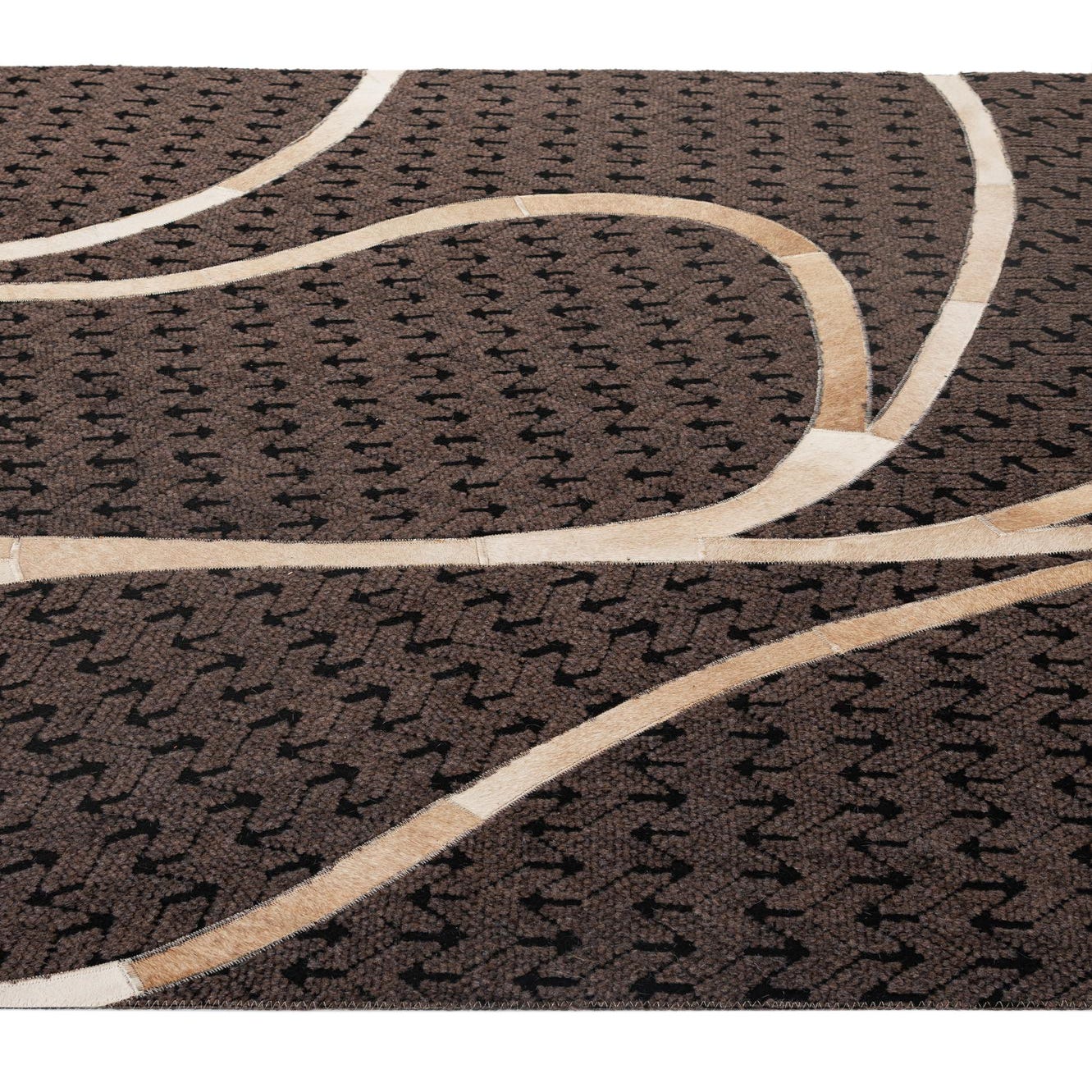 A 5x8 rectangular Cowhide & Leather rug featuring a modern abstract pattern of light brown and tan curved lines on a dark brown background.