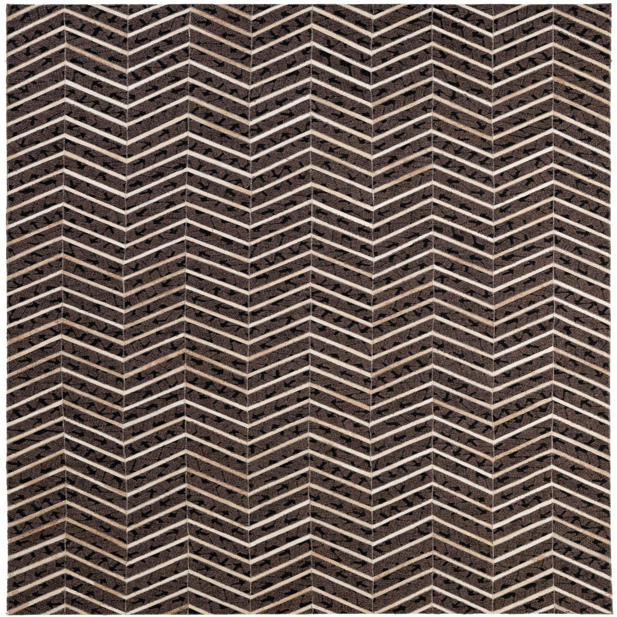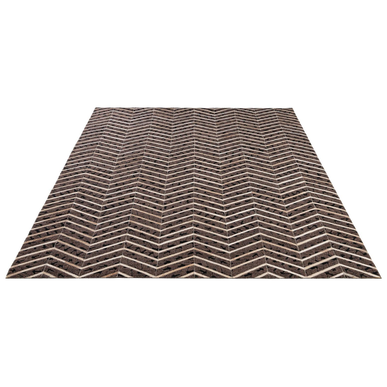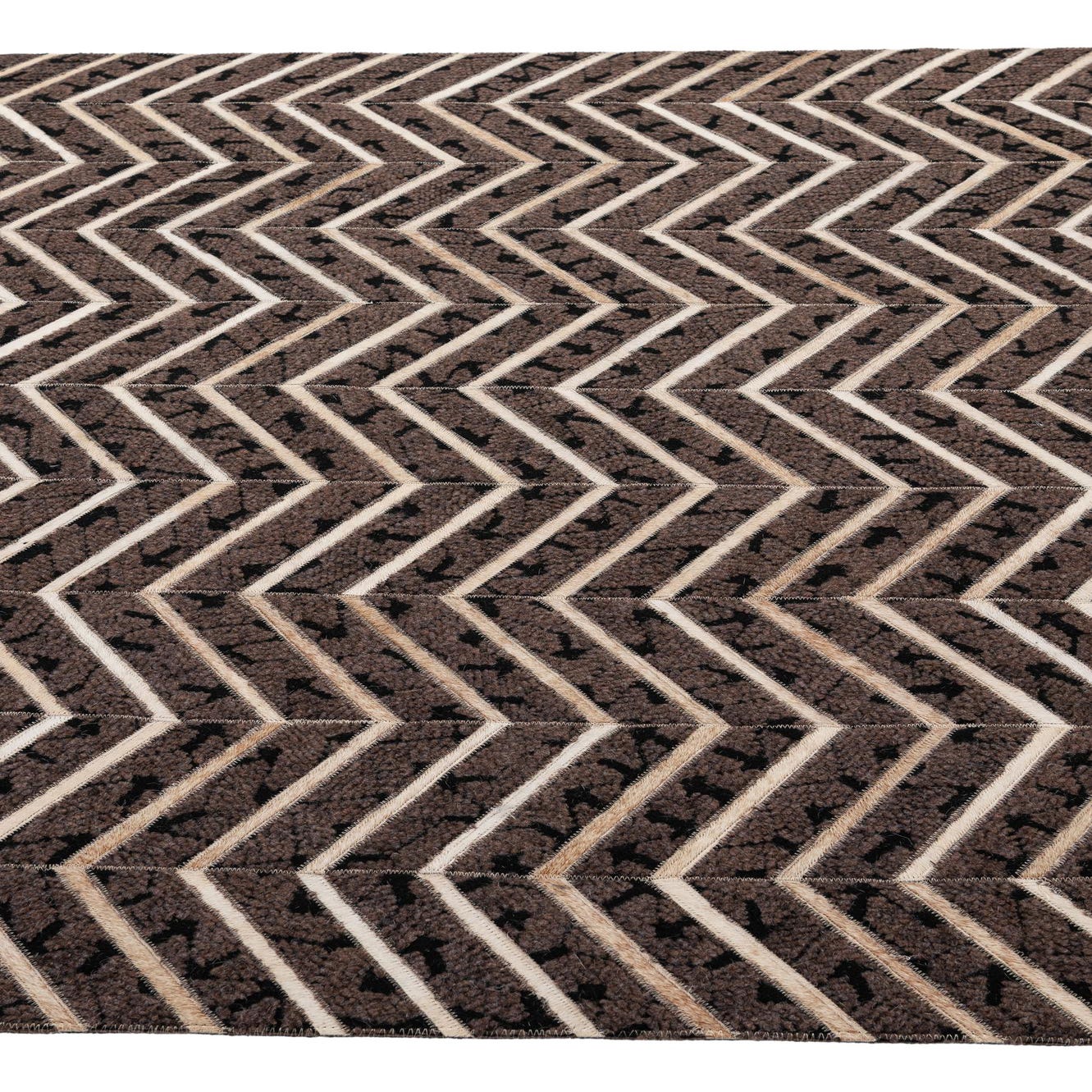 A 5x8 rectangular Cowhide - Patchwork rug featuring a modern chevron pattern in varying shades of brown and tan.