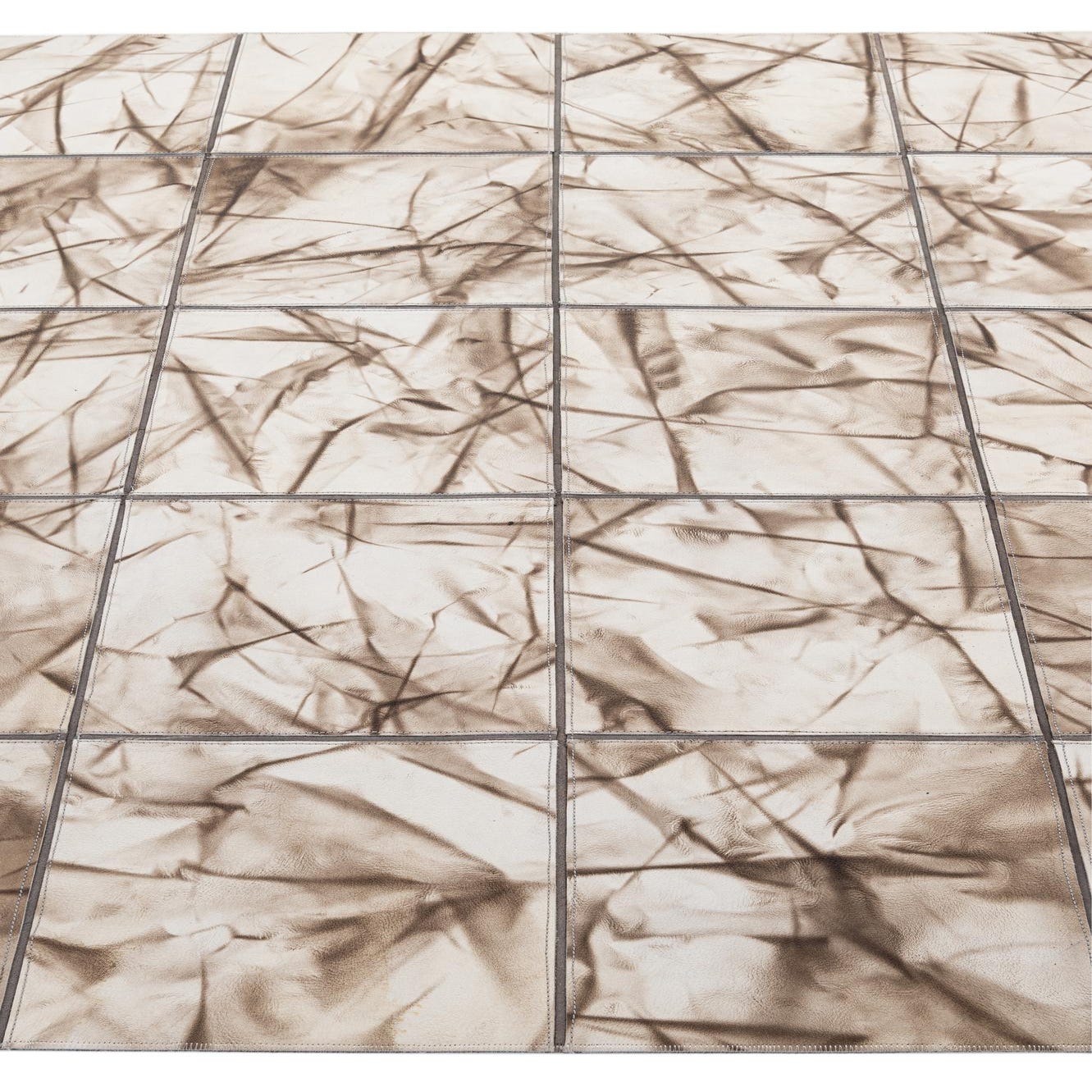 A 5x8 rectangular Cowhide Patchwork rug in shades of brown and tan, featuring a modern abstract design of stitched squares.