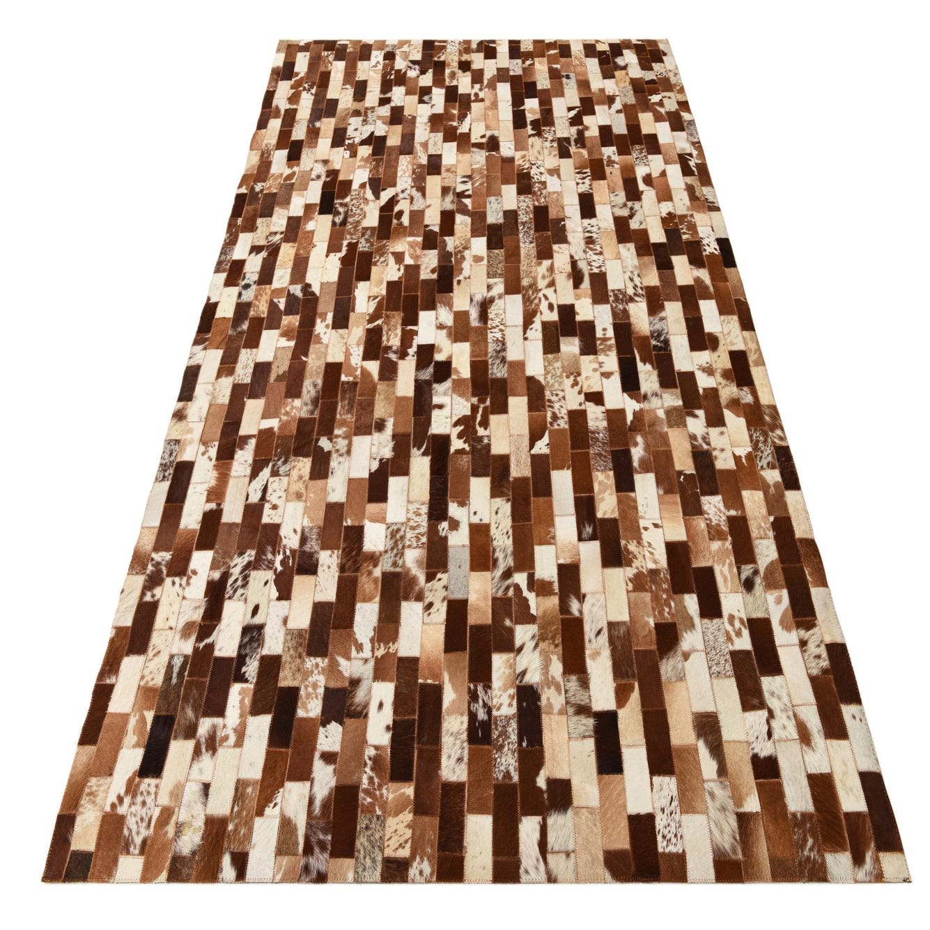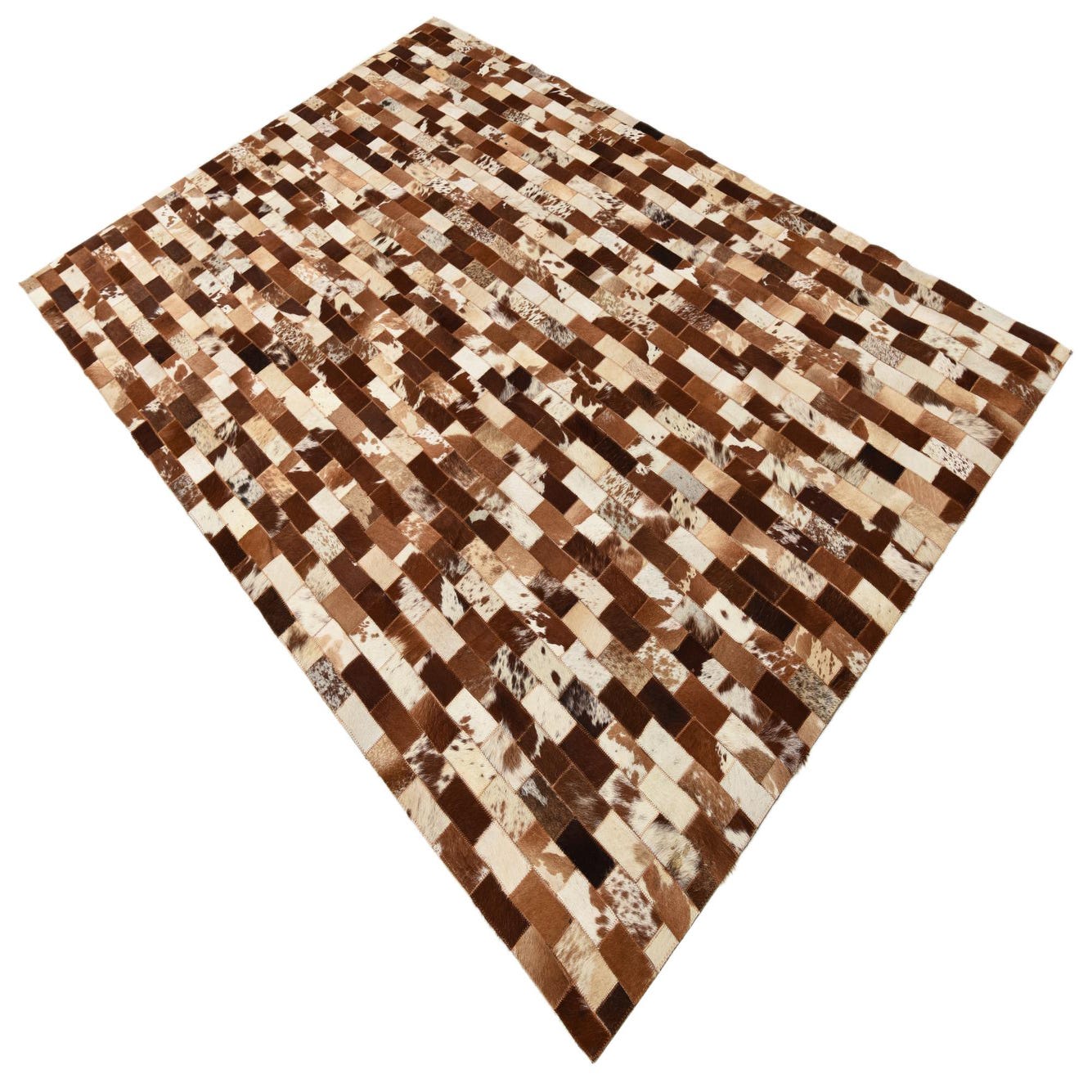 A 5x8 rectangular Cowhide rug featuring a modern stripe pattern of various brown and tan patches.
