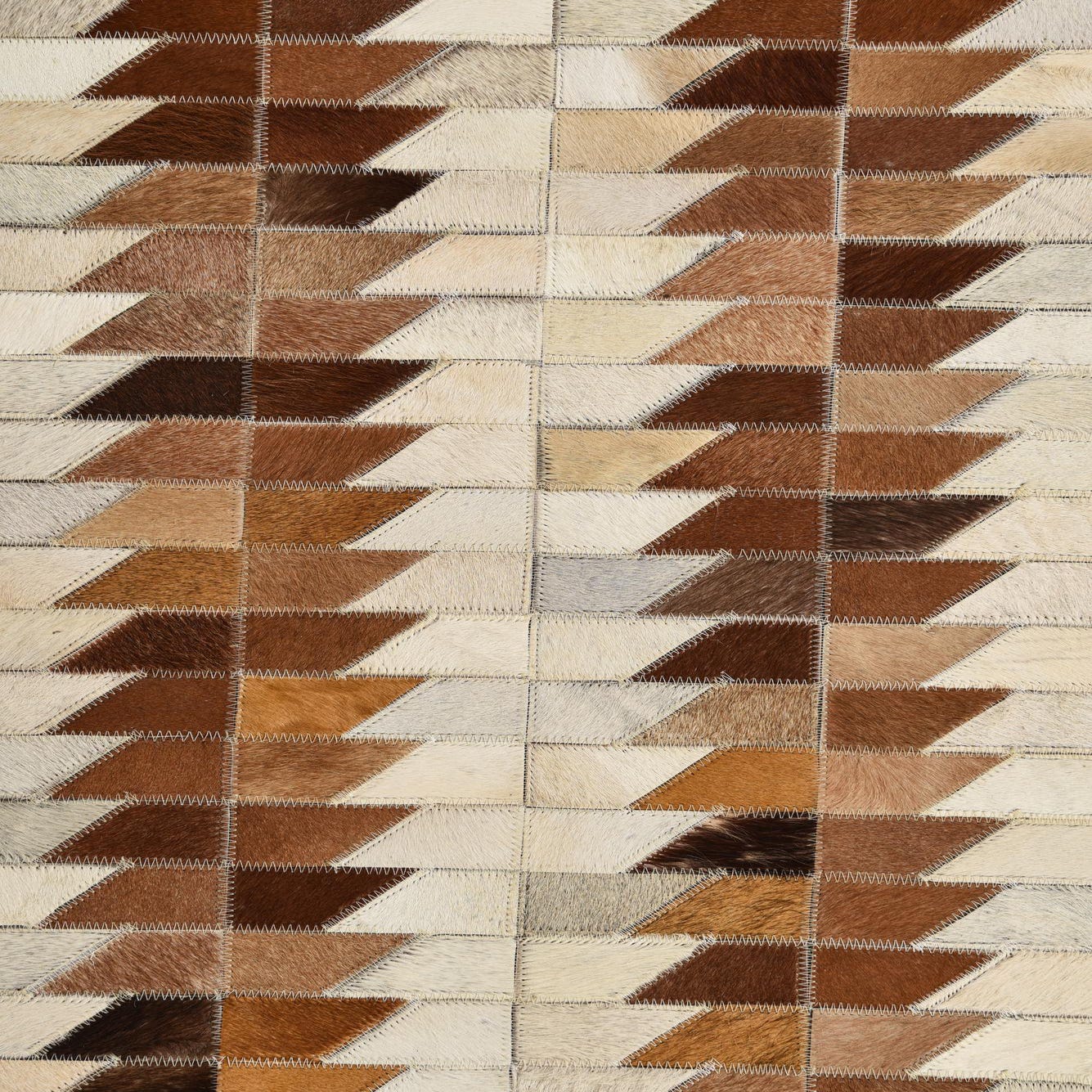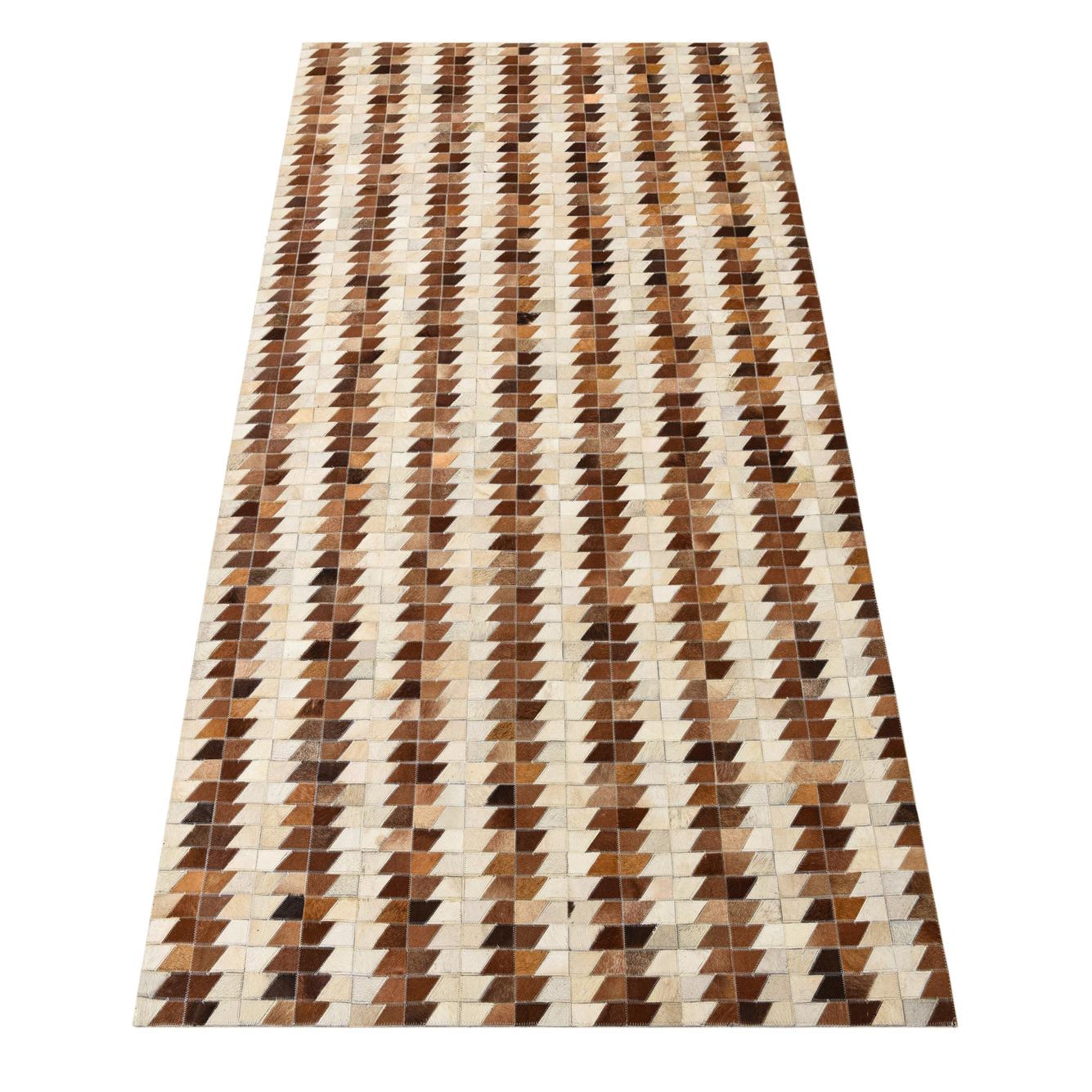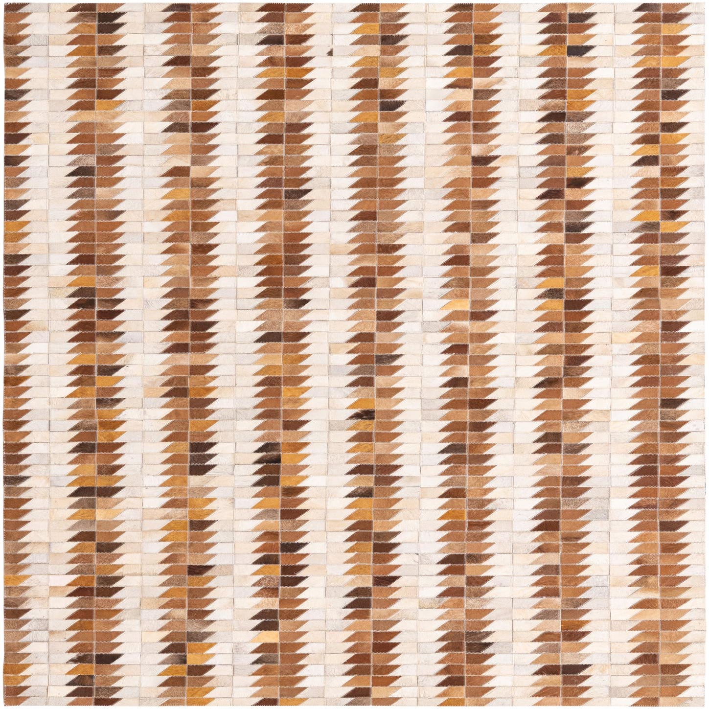A 5x8 rectangular Cowhide rug featuring a modern geometric pattern of alternating brown, tan, and cream leather patches.