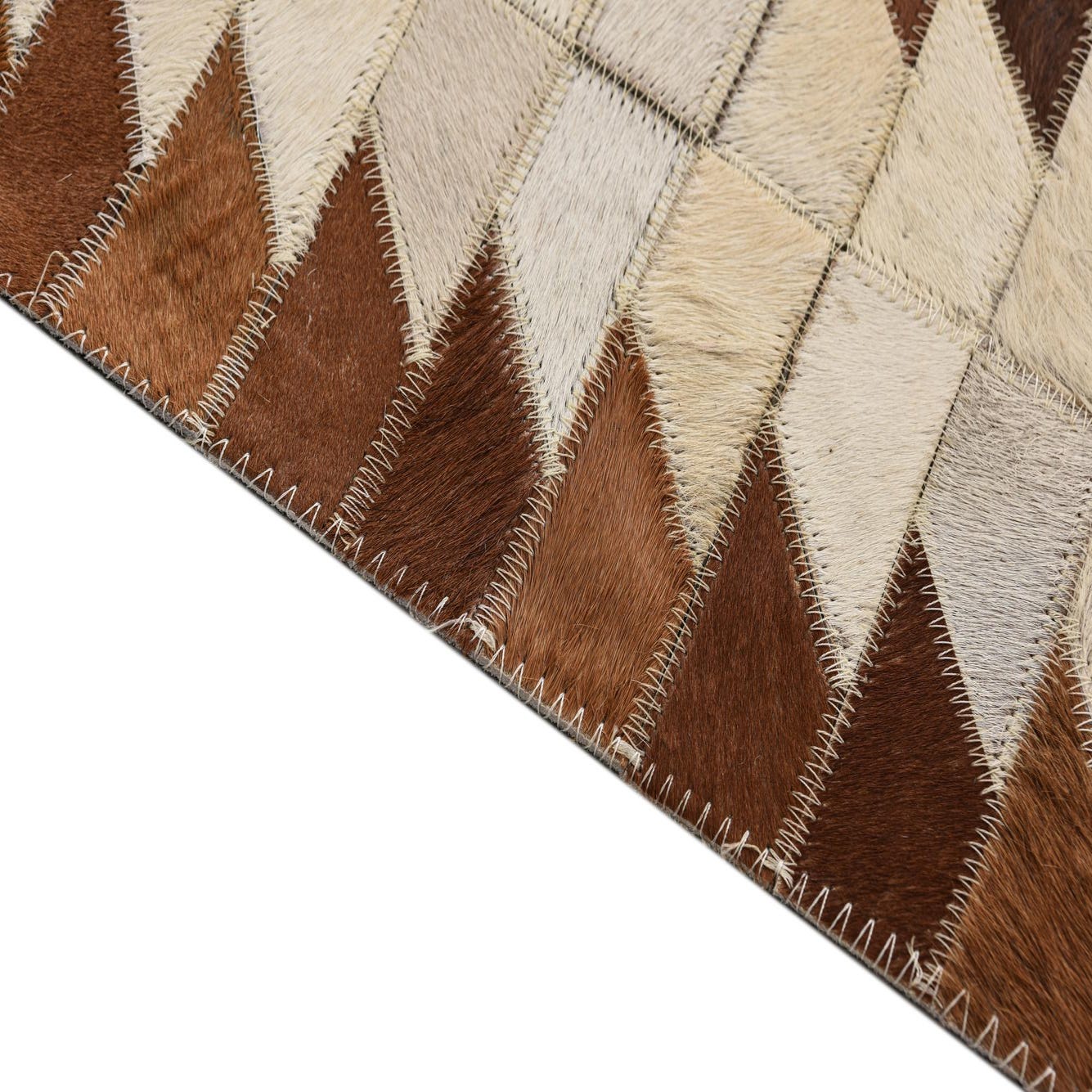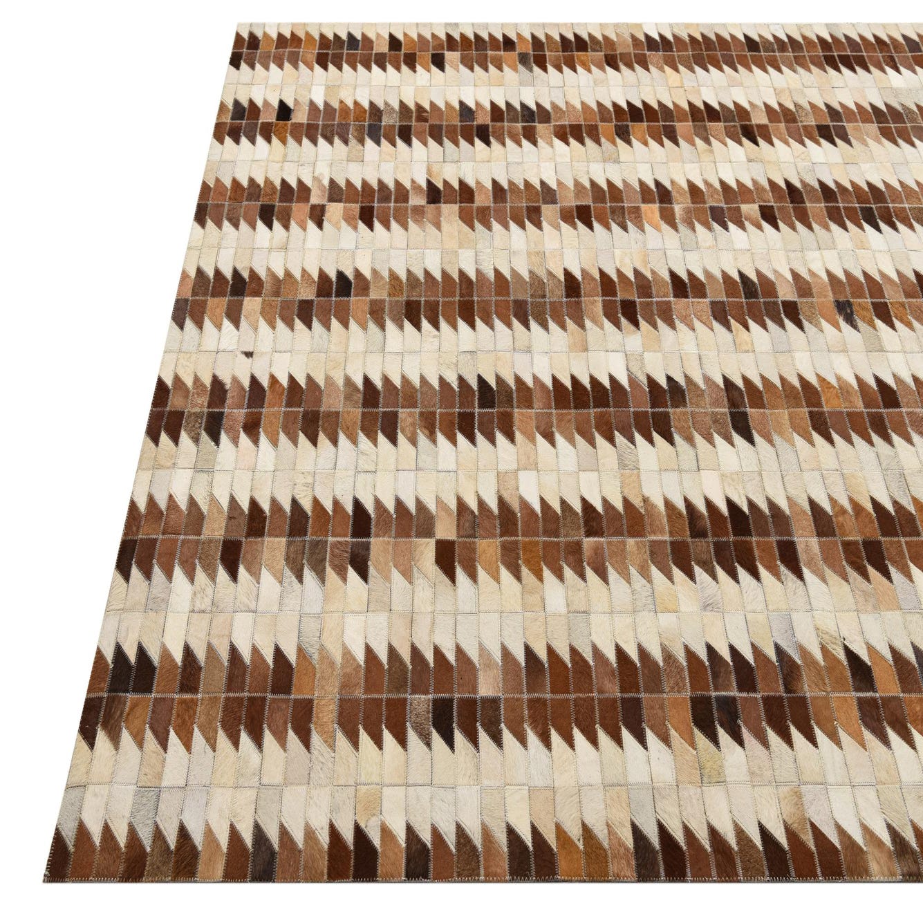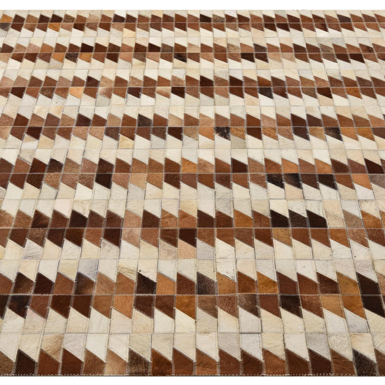 A 5x8 rectangular Cowhide rug featuring a modern geometric pattern of alternating brown, tan, and cream leather patches.