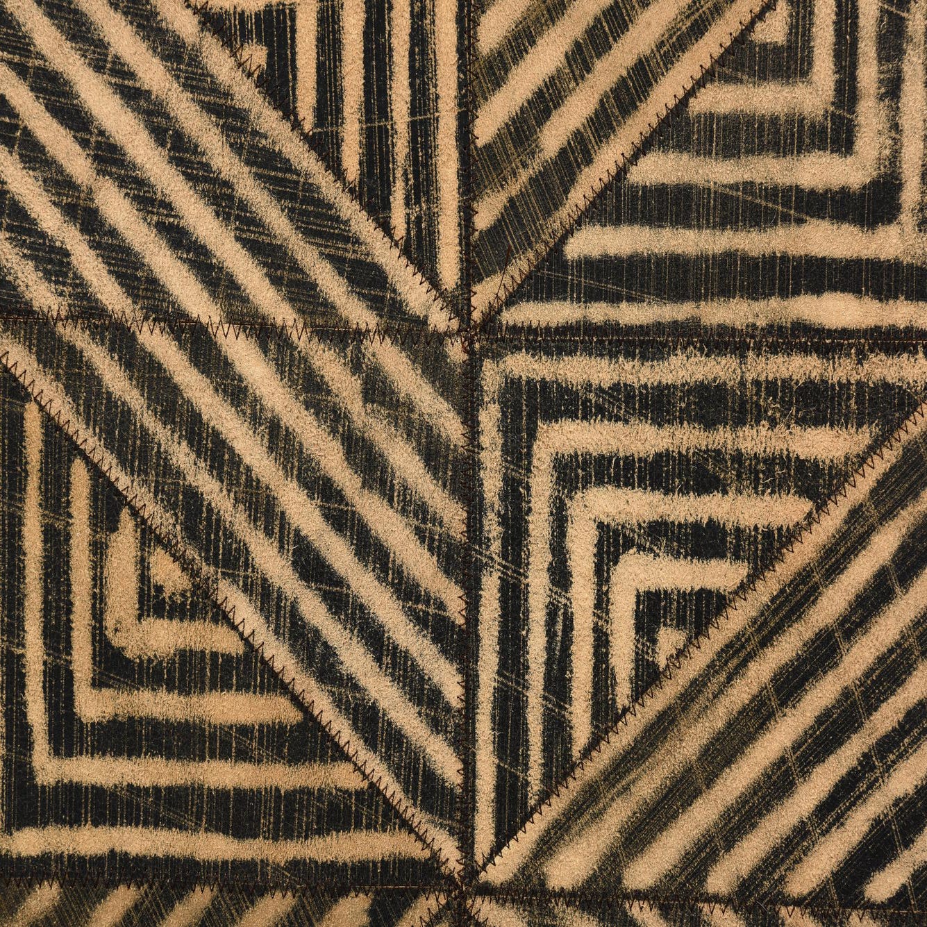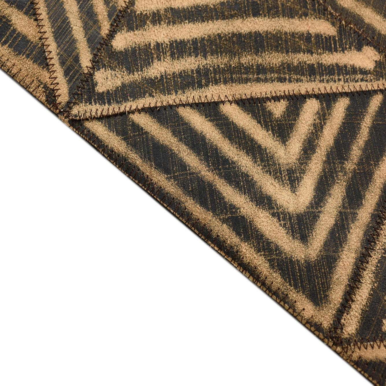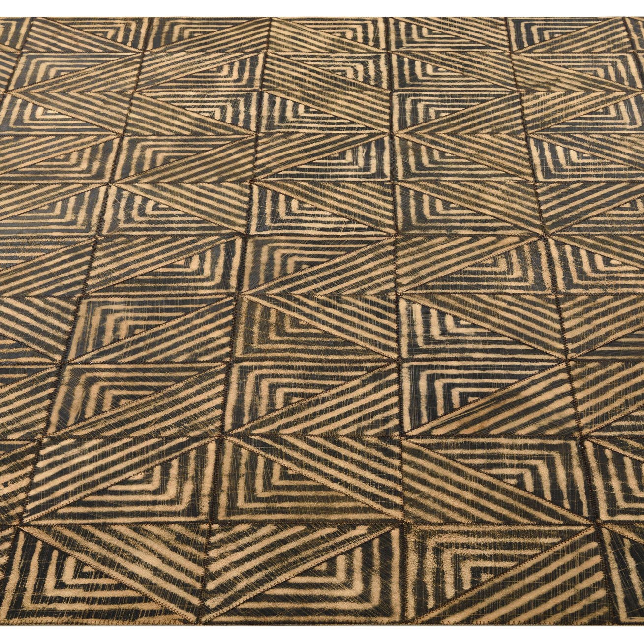 From the Cowhide collection, this handcrafted 5x8 rug presents a harmonious blend of brown and beige tones in a distinct geometric pattern. Constructed from genuine cowhide and leather, the rug showcases a series of intricately arranged shapes that create an engaging optical illusion, leading the eye across the surface in a dynamic play of lines and angles.