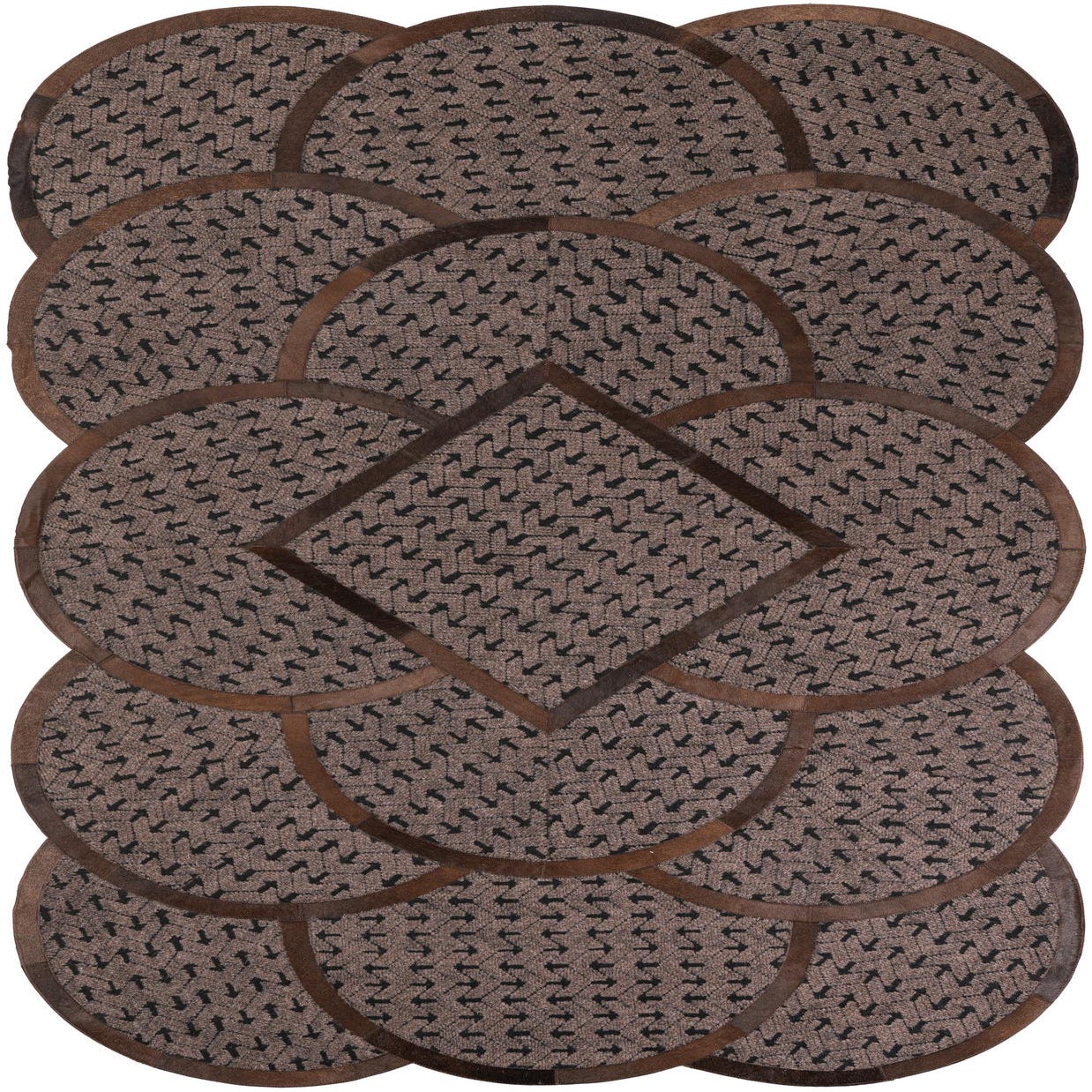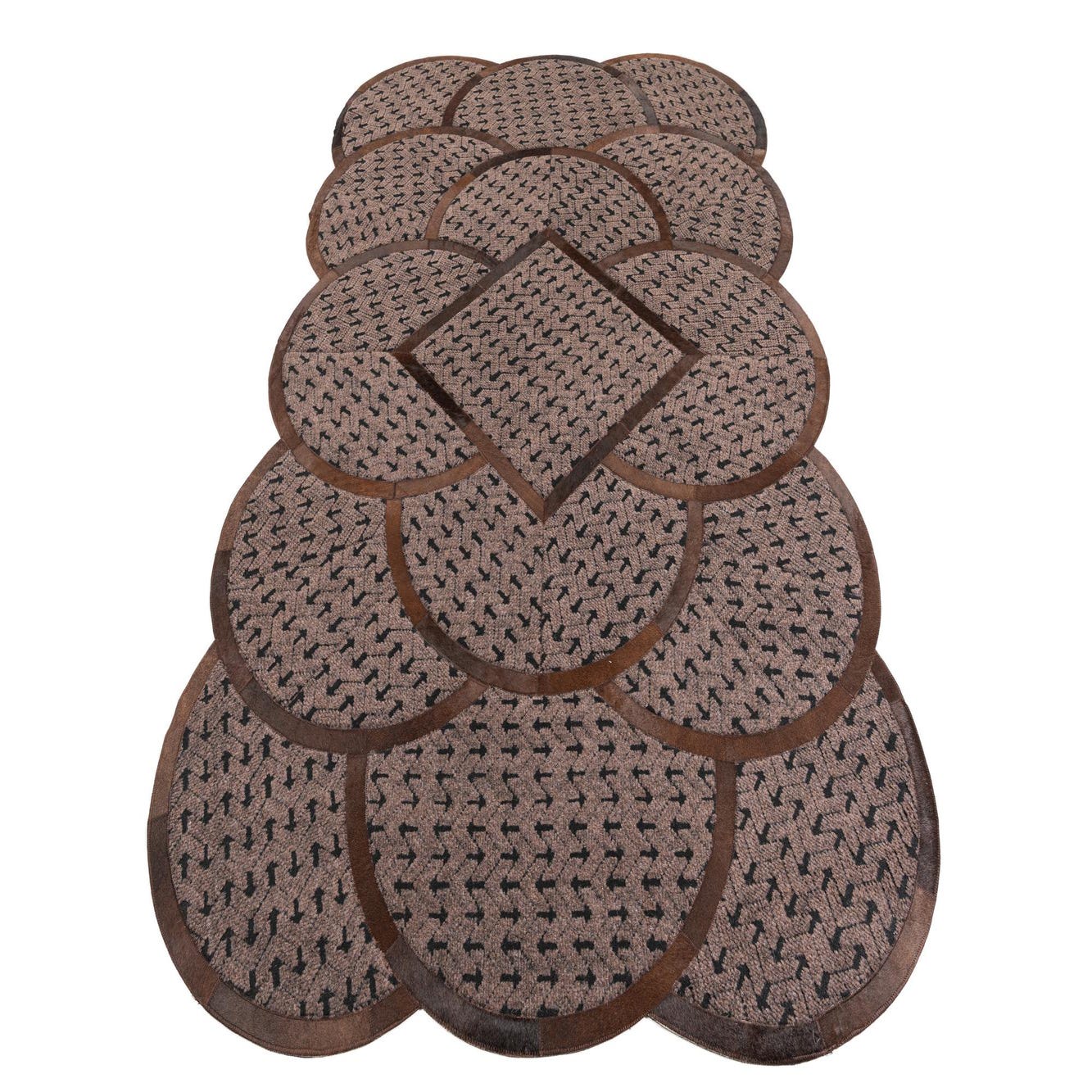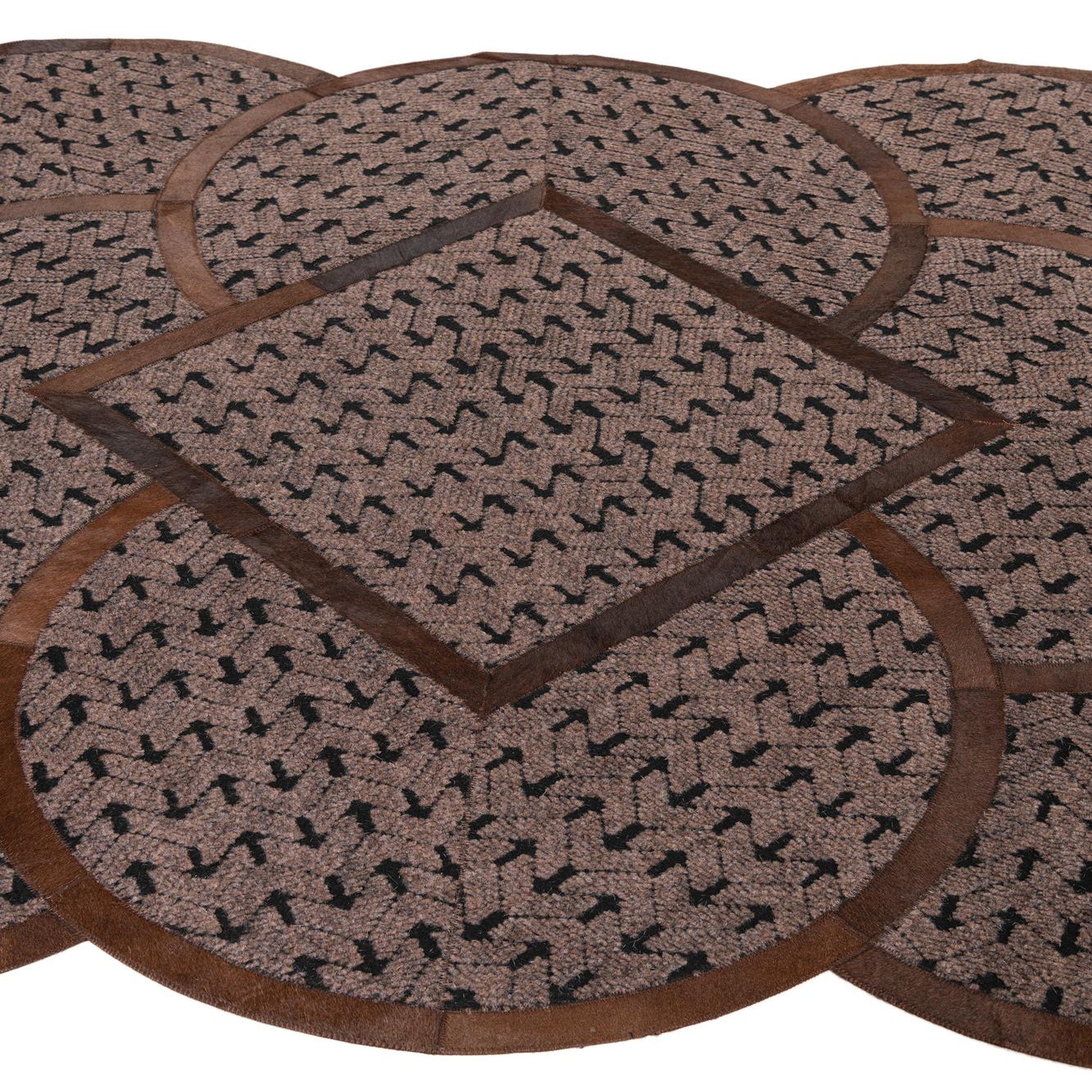 This rug is a scalloped patchwork of overlapping circular panels with a centered diamond insert, each panel carrying a small-scale black zigzag motif set against a warm brown background. Rich leather seams outline every panel, creating a defined geometric silhouette and a subtle contrast between the matte hair-on-hide surface and the smoother leather trim. Hand made of cowhide and leather, the piece has a low-profile, tactile nap that feels natural underfoot and shows the material’s inherent grain and texture.