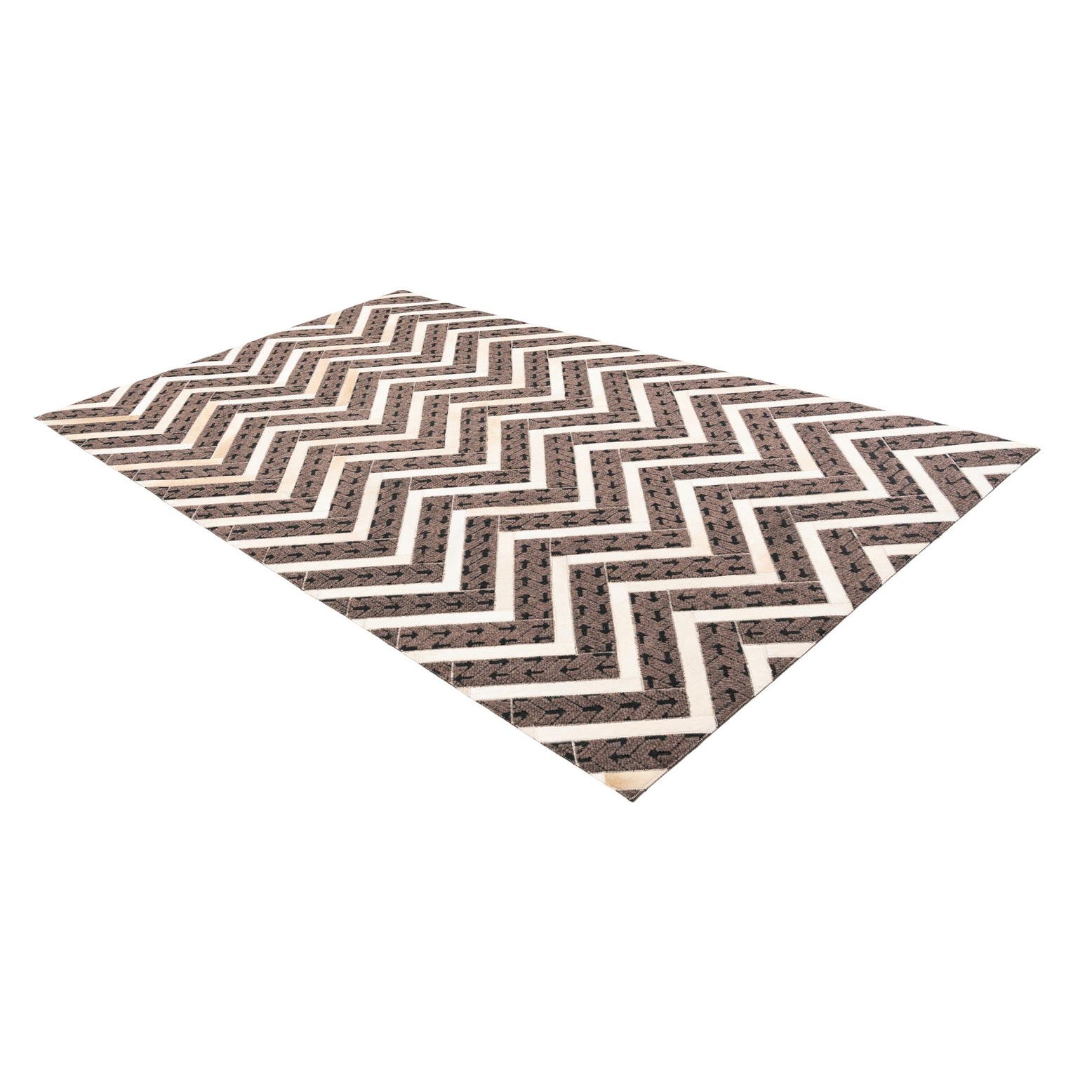 A 5x8 rectangular Cowhide Leather rug featuring a modern chevron pattern in shades of brown and tan.