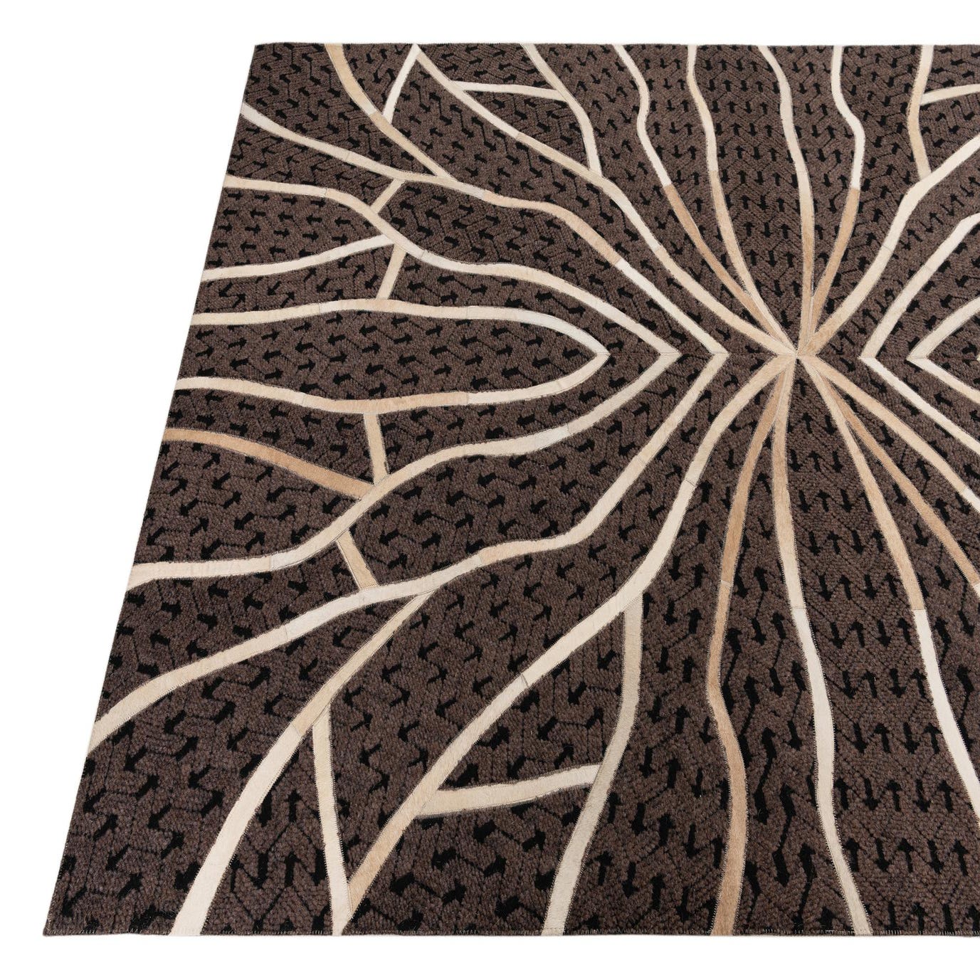 A 5x8 rectangular brown and tan cowhide leather rug with a modern, abstract branching pattern.